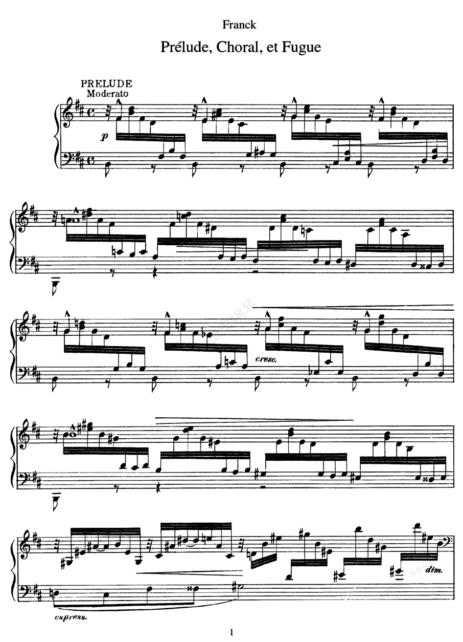 前奏曲、圣咏与赋格, et Fugue 《前奏曲、圣咏与赋格》, et Fugue ,作于1884年。这是一个非常有独创性的作品,柯尔托说:“这真是天才的神妙的作品,它融合了原有的严格形式,并把它予以人性化,在毫无损及其原有的威严下,赋予了感动性的力量与震撼性的感情。”弗朗克的学生丹第赞道:“自贝多芬以后第一次出现的值得推崇钢琴音乐。”“在这一作品里,充满了此圣咏调的旋律的精神,在这种情形下所产生的作品,才是纯粹的属于富有个性的作品。这首钢琴曲可以说是古今所有钢琴曲中形式和内容都非常特殊的作品,同时它在所有的钢琴音乐中,经常都站在第一流的地位,这是毋庸置疑的公认的事实。” 乐曲的前奏曲与圣咏,一点一点地逐步暗示和准备赋格的主唱,当赋格发展开来之后,在前奏曲的流动中,唱出了圣咏调旋律,于是赋格的主旋律重叠在一起,最后圣咏调才开始变为大调,奏出凯歌。