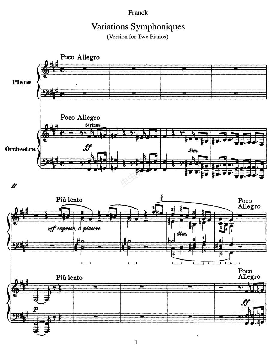交响变奏曲 - 为钢琴与乐队而作 弗朗克是比利时的重要作曲家,后定于居法国巴黎,他的作品对法国的后期作曲家如拉威尔、德彪西都产生过极大的影响。他的创作主要分为三个时期:早期作品受到格雷特里等喜歌剧作曲家影响,中期主要为宗教性作品,晚期作品则发展为“套曲形式”。 《交响变奏曲》 作于1886年,是晚期作品中极具代表性的一部作品(除此以外的是d小调交响曲和A大调小提琴奏鸣曲),全曲以两个对比鲜明的主题展开精美神妙的循环式发展,在五个变奏中逐步达致高潮,在最后一个变奏中仍然使用了其管用的卡农手法,充满无限的幻想。 这是一首融协奏曲风格与变奏发展为一体的乐曲,近似一首单乐章的协奏曲。它有相互对比冲突的主题材料和统一发展的线索,从痛苦不安,疑问探求到充满信心,肯定生活,也有各个不同的发展阶段和思想境界,但故意抹平各段之间的界线,使全曲贯穿发展。钢琴有时是乐队中的一员,有时起独奏乐器的作用。这种处理方法对他的学生肖松,丹第等人有很大影响。