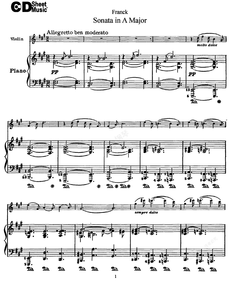A大调小提琴奏鸣曲 in A Major for and piano 弗朗克在他的一生中只写了一首小提琴奏鸣曲,也就是《A大调小提琴奏鸣曲》 for and piano in A Major 。这首曲子完成于1886年,当时他六十四岁,并且将这首曲子献给他一直相当提拔的后进-易沙意,作为他结婚贺礼。而这首曲子的首演,正是由易沙意与他的夫人共同演奏,于同年在比利时的布鲁塞尔一地举行。法国近代音乐的发展,一直受到法朗克与圣桑二人的影响甚巨,其中的法朗克虽独钟古典端正的形式与纯粹的器乐美感,但是他却以一种清新的角度,为他的音乐写入优美深邃的乐句。特别这一首作品是弗朗克的晚年创作,更显均衡的稳重感,是一首愈听愈让人着迷的作品。 整体而言,由四个乐章所组成的A大调小提琴奏鸣曲,在弗朗克大胆独创的革新下,先就曲式架构上于第三乐章安排不同于以往的幻想曲风,沉重的宣叙调在小提琴如歌似的优美歌咏下,辗转地表达出弗朗克对于旋律的强烈情怀,同时也开启相对于末乐章的鲜明对比。 被视为十九世纪末影响法国音乐最深远的作曲家之一的弗朗克(Cesar, 1822-1890),在他六十四岁的时候写了一首小提琴奏鸣曲,这是他为一位来自比利时的小提琴演奏家易沙意( Ysaye, 1858-1931)所写的结婚贺礼,也是在他晚年继钢琴五重奏之后的另一首器乐曲杰作。虽然这首A大调小提琴奏鸣曲是近代法国小提琴音乐史上的上乘之作,但是当时法国社交界对法朗克音乐的肯定却是在他去世之后,终其一生,法朗克默默的在教育界耕耘,同时培育出不少优秀的后进如:肖松、杜帕克等高足,甚至并非他的学生像是德彪西,也深受其音乐风格的影响。弗朗克的音乐虽然盈满着法兰西斯的浪漫风情,但是与同期的圣桑所不同的是,他遵循德奥一派古典的形式,以丰富的和声与高雅的旋律线条,走出一条独创性的大道。以这首小提琴奏鸣曲为例,弗朗克使理性化的架构下饱含热情浪漫的乐思,冷热调和之均匀,谱出优美如歌似的旋律乐句,着实一新当时的作曲技法。整体而言,由四个乐章所组成的A大调小提琴奏鸣曲,在弗朗克大胆独创的革新下,先就曲式架构上于第三乐章安排以往不曾有过的幻想曲风,沉重的宣叙调在小提琴如歌似的优美歌咏下,辗转地表达出弗朗克对于旋律的强烈情怀,同时也开启相对于末乐章的鲜明对比。再者,于第一乐章出现的中心乐句(第5-12小节),弗朗克则采取循环的方式,发展出变化的音型,一一再现于各个乐章中,求取乐曲整体的一致性。此外,在第四乐章的回旋曲式中,弗朗克缜密安排之前曾经出现过的乐句作复现,一统不同的性格与情绪,在乐曲的最后作出强而有力的收束。这首作品在完成后的同一年,便由受赠者易沙意与他的夫人 Marie Pene的合作下,于比利时的首都布鲁塞尔举行首演,隔年在法国巴黎的国民音乐协会演出,并没有受到广大的回响。不过这首作品真正得到大众的青睐,已是1890年以后,也就是弗朗克离世以后的事了。 第一乐章,经过简略的奏鸣曲式,首乐章在钢琴稳重的和弦弱奏下揭开序幕,小提琴以清新悠扬的音色圆滑地奏出两个小节的动机音型,这是构成第一主题旋律的主要音型。随着主题旋律朴实的起伏,缓缓的引导出优雅浪漫的气息。由于该主题不仅仅是首乐章的主体,更是整首乐曲的灵魂所在,因此,弗朗克在宣示该主题旋律后,便径自以该主题旋律的音型做基础变化,流露出更深更浓的情感。进入第31小节后,这时的小提琴退出,由钢琴独自地奏起第二主题的旋律,在右手引导下的第二主题,像是挣脱厚重的枷锁后扬起快活的曲调,但是不一会儿却又在左手低音部仓促的音阶奏里,唱着内心深处炽热的情感。而首乐章就在两个主题相继的呈示过后,以细腻的手法表达最直接而强烈的乐思。随着第47小节出现小提琴复诵的第一主题,钢琴从旁以轮唱的方式由右手奏着八度音程尾随唱和着,经过短暂的发展,钢琴又回到平静的和弦奏,静静地让小提琴唱着第一主题的动机音型,最后再悄悄地为呈示部划下一个暂时的句点。在主题性格强烈的展示后,弗朗克舍弃将主题乐句加以发挥的乐段(也就是一般所见的发展部),乃以简单的四个小节的过门乐句,直接地进入再现部,再次强力的对听众诉诸中心乐旨。由小提琴以相同音高再现第一主题乐句的第63小节也正是再现部的开始。而此时出现的钢琴则改以更为厚重的和弦,为主奏的小提琴伴奏着,依序再现第二主题,宣示两个主题乐句后,进入第108小节的尾奏。以第一主题动机音型为基本架构的尾奏,在小提琴与钢琴完美的调和下,以非常单纯的搭配,娓娓的道尽这充满神韵的第一乐章。 第二乐章,继充满感情的第一乐章之后,进入的是整首乐曲最为热情有活力的第二乐章。以快板速度写成的第二乐章,在经过前面三个小节的钢琴引导后,立即转入热切的中强节奏,为即将出现的第一主题旋律热身。第14小节出现的第一主旋律由小提琴以充满活力的音调强奏而出,随着该主题音型变化而来的阵阵强奏,为该乐章做出强而有劲的开场。而后情绪像是被稍事平抚般的,随同钢琴转入一小段的间奏乐段,让再次出现的小提琴平静的承奏发展主题旋律(第29小节),由弱渐强的引导第一主题旋律的复出,为这条主要的旋律线勾勒出鲜明的轮廓。最后出现的一小段强奏(第44-47小节),则是弗朗克刻意的将首乐章的第一主题的动机音型变化得来的,作为进入第二主题的