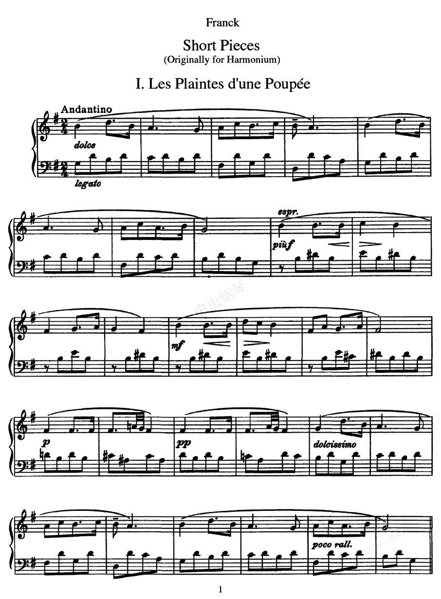 18首小品 18 Short 《管风琴小品》Short for ,是由弗朗克从他的管风琴小品中选取了十八首改编成的这部钢琴演奏小品集。虽然每首小品篇幅不长,技巧也不难,但是音乐性极强,这对于学习弗朗克的作品风格和演奏他的大型作品都非常有好处。 1. 洋娃娃的悲叹 Les d'une,G大调,2/4拍,小行板。 2. 克勒兹之歌 Chant de la,d小调,2/4拍,非常连贯的。 3. 无标题,降G大调,4/4拍,稍慢的。 4. 无标题,e小调,4/4拍,稍快的小行板。 5. 贝亚恩之歌 Chant,G大调,3/4拍,稍快的小快板。 6. 圣母玛利亚前奏曲 pour l'Ave Maris,d小调,3/4拍,稍快的小行板。 7. 第一号卡农 Canon I,E大调,4/4拍,稍快的小快板。 8. 无标题,升c小调,3/4拍,稍快的快板。 9. 无标题,降G大调,3/4拍,稍快的小快板。 10. 慢板舞曲 Danse Lente,f小调,2/2拍,非常慢的。 11. 昂热的圣诞歌 Noel,G大调,3/4拍,小快板。 12. 无标题,降A大调,3/4拍,稍隆重的。 13. 无标题,降A大调,3/4拍,可爱的小快板。 14. 无标题,A大调,3/4拍,中速的小快板。 15. 无标题,升c小调,3/4拍,慢板。 16. 无标题,f小调,2/4拍,小快板。 17. 第二号卡农 Canon II,降D大调,6/8拍,小行板。 18. 无标题,升f小调,2/4拍,稍快的快板。