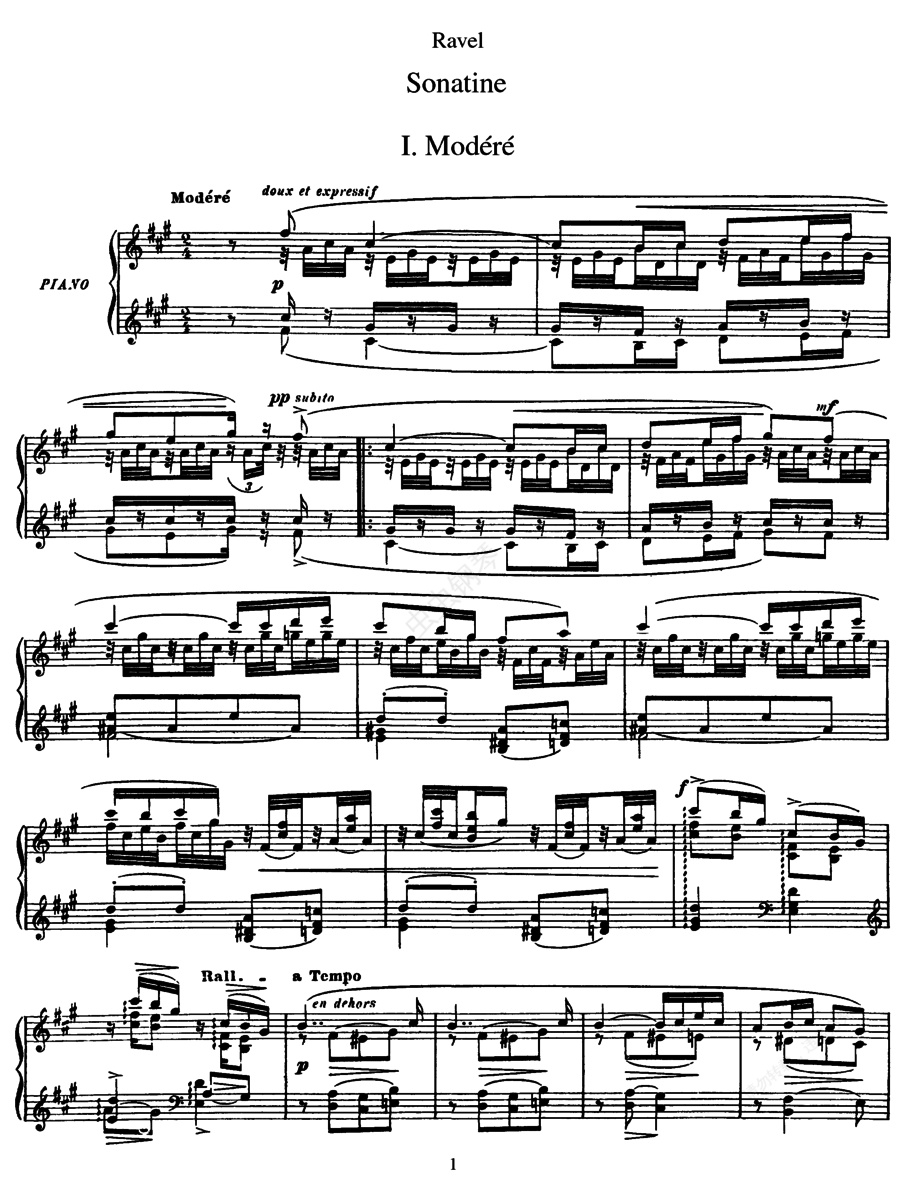 钢琴小奏鸣曲 Piano 《钢琴小奏鸣曲》Piano ,作于1901年,是拉威尔早期的作品,原是一首参加一家音乐杂志举办的作曲比赛的应征作品,演出后受到广泛的欢迎,后正式出版。此曲的结构精练,技术纯熟,是拉威尔创作趋于成熟的又一代表作。全曲的旋律大多是教会调式,运用了古典的调性结构原理,基本调性为升F大调。全曲共三个乐章: 第一乐章,采用严谨的古典曲式结构,但更为短小精练。第一主题在内声部华丽的伴奏音型衬托下在高声部奏出。音乐极富法国式的优雅、清晰的特色。第二主题赚到中音区,仍保持抒情的意味。展开部先是以古典的形式保持第一主题,接着是第二主题的发展。这部分虽不长,和声手法却极为精致而变化多端,具有印象派和声的效果。 第二乐章,按照古典规范采用了小步舞曲题材,但旋律却运用了色调倾心的自然调式。主要主题用第一乐章第一主题开始的动机构成。中段主题由两段主题音调发展而成,从而加强了音乐形象的内在联系。 第三乐章,速度变为急板,在三小节急速的序奏后,出现的是一个生气勃勃而附有冲击力量的主题,活跃的气氛构成了这个乐章的基调。在后来的展开中,还可以听到第一主题的再现。通过乐章间音调上的联系,使这个小型套曲的音乐形象具有高度统一的艺术形象。