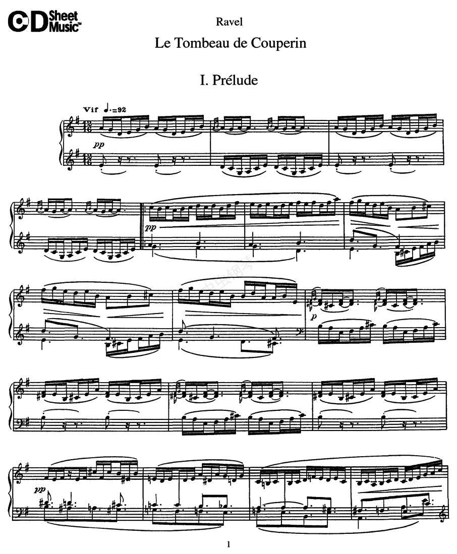 库普兰之墓 Le de 拉威尔非常喜爱法国十七、十八世纪羽管键琴作曲家库普兰等人的作品,这部《库普兰之墓》Le de 就是他采用了那时常用的舞曲题材和典雅优美的风格写成的,作于1917年,很明显地显示了他模仿古典的倾向,但在乐曲中却赋予了现代的作曲技术,使之显得十分新颖。全曲包括六首小品,拉威尔用来分别纪念在第一次世界大战牺牲的六位友人。 1. 前奏曲 Prélude(纪念杰克·夏罗中尉 To the of) 乐曲用二部曲式。第一主题轻快流畅,在左右手相互模仿中进行,其中夹有渐强纤细的装饰音。第二主题抒情优美,在乐曲中拉威尔用大量的装饰音来模仿库普兰的创作风格。 2. 赋格 Fugue(纪念格尔普少尉 To the of Jean) 这是一首三声部自由的赋格曲,乐曲虽小却有丰富的内容。其中包括赋格主题的转为以及丰富的旋律线条。 3. 弗尔兰舞曲(纪念德里克中尉 To the of Deluc) 弗尔兰舞曲原是威尼斯游船竞赛时跳的舞蹈音乐,18世纪流行于欧洲各国。库普兰、巴赫都写过这种题材的舞曲。拉威尔将原来快速的6/4拍改为小快板的6/8拍,音乐简朴明快,拥有崭新的和声。 4. 利戈顿舞曲(纪念巴斯卡·果丹·皮厄尔兄弟 To the of and) 利戈顿舞曲原是法国南部普洛旺斯的民间舞曲,节奏活泼生动,18世纪曾流行于欧洲各国。拉威尔创作的这首乐曲有民歌风的旋律,和声却有自己的特点,十分丰富多彩。 5. 小步舞曲 (纪念简·德勒费斯 To the of Jean) 乐曲模仿法国宫廷小步舞曲的典雅风格,由八小节的主题发展而成,旋律有古钢琴曲的性格。 6. 托卡塔(纪念约瑟·德·玛利亚上尉 To the of de) 这是一首技巧很难的托卡塔,由无穷动似的短音符装饰而成。活跃的主题动机经变位、变型而出现全曲,成为本乐曲的基础。