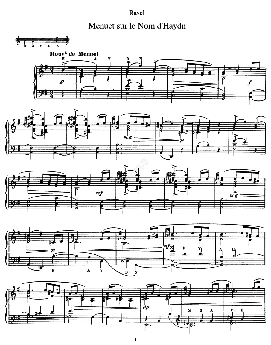 以海顿之名而作的小步舞曲 sur le nom d' Haydn    《以海顿之名而作的小步舞曲》 sur le nom d' Haydn ,这首简短的钢琴作品是受朱尔斯·埃科查维尔(Jules &;) 的委托为纪念海顿逝世100周年而作,作于1909年9月。并与1911年3月11日由恩纳默德·秋勒() 首演。此项活动的其他参与者有德彪西、杜卡斯、汉纳、丹第以及维多。    这首作品是以“海顿”之名,,也就是为动机而写成。G大调,3/4拍,小步舞曲速度。