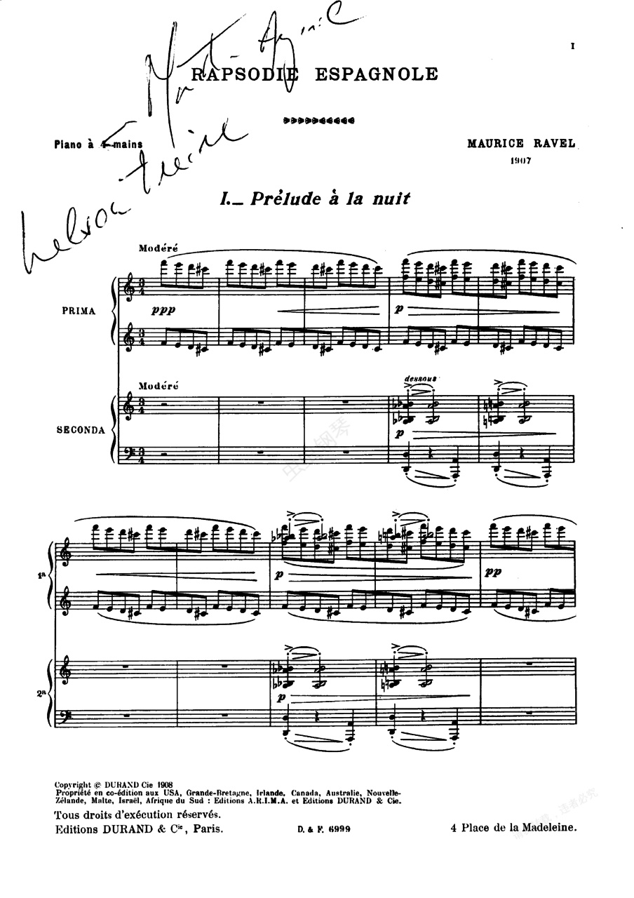 西班牙狂想曲 拉威尔于1907年用油画的手法为我们展现了一部杰作《西班牙狂想曲》 ,于1908年3月15号在巴黎首演。许多听众认为这部作品是无与伦比的,它以如画般的手法描绘出浓郁的西班牙气氛和西班牙的精神。西班牙作曲家法雅对这部作品的评价最为中肯:“这首狂想曲让人吃惊的是通过运用我们西班牙‘流行’音乐的调式和装饰音型,它所表现出来的纯粹的西班牙特性丝毫没有被作曲家的自身风格所改变。” 在作曲家精心创作出的奇妙的管弦乐作品之前,拉威尔习惯性为他所钟爱的钢琴创作每一部签约作品。而这部管弦乐作品却是个例外,其中的哈巴涅拉源自于他1895年创作的一首双钢琴作品。全曲共分为四个部分,分别表现西班牙的四种性格: 1、夜的前奏曲 a la nuit ,乐曲一开始就像朦胧的雾霭,弦乐的低音拨弦和小提琴、中提琴奏出的若隐若现的下行持续音型,描绘出火热的西班牙夜空的安静气氛,这一富有特性的音型逐渐转移到其它乐器上,成为贯穿全曲的背景.在这个背景上,首先长笛和单簧管奏出了一个略带倦意的旋律,紧接着出现了弦乐的悄声低语,然后是乐队的全奏,好象是人群不断传来的欢快的作乐声。当人群离去后,只剩下长笛和单簧管奏着柔和而又华丽的单调,随着这充满神秘感觉和奇异色彩的变化,乐曲重又回到了安然而宁静的气氛中。整个乐章在一片沉静的消逝感觉中结束。 2. 马拉圭娜舞曲&;a ,马拉圭娜舞曲原是西班牙南部安达鲁西亚地区的一种民间歌舞形式,这种歌舞一般是在吉它的伴奏下进行的即兴表演。拉威尔运用了这一民间音乐体裁创作了一个短小精湛、色彩斑斓的乐章。乐曲一开始,首先在低音提琴上出现了一个活泼明快的节奏音型,以弦乐低沉的拨奏和木管乐器低声的席卷而过的音型开场,预示了不祥的征兆。长笛和其它乐器演奏着经过装饰的乐句,紧接着,小号像一个斗牛士一样伴着强烈的节奏紧张地闯入,辉煌地奏出了具有舞蹈风格的曲调。音乐经过逐渐发展,达到了极端热烈奔放的程度。在这时,英国管又独自奏出一个带有忧伤色彩的引起回忆的旋律,最后,整个乐章在安静的气氛中结束。 3. 哈巴涅拉 ,哈巴涅拉原是起源于古巴的一种民间三拍子舞曲,其特点十分突出,就是多带有切分节奏。十九世纪中期传入西班牙,许多作曲家在作品中都采用这种舞曲。拉威尔的这首"哈巴涅拉"原是他于1895年创作的一部双钢琴曲《耳闻的风暴》Sites 中的第一首(这部作品的第二首为“钟声荡漾”,首演时惨遭失败。)。拉威尔将它配器后,作为这部作品中的一个乐章。这个乐章首先以一个简短的序奏表现出哈巴涅拉的特性节奏,然后出现两个主题,高音域的木管乐器和弦乐器唱出了经典的哈巴涅拉风格,这两个主题逐步地发展一直到结束,这个乐章带有一种神秘的朦胧色彩,其调式使整个作品的气氛宁静而舒缓,让人感受到在地中海阳光下缓慢而踏实的感觉。 4. 集市 Feria ,这个乐章表现出一种夜晚集市的热烈和喧闹场面。全曲共分三个部分。第一部分,乐曲开始先描绘了黄昏的来临,紧接着长笛和加弱音器的小号演奏出细碰碎的音型,描绘了一派节日欢腾的场面。人们唱歌跳舞,无限喜悦,最后达到狂欢的程度。乐曲的第二部分音乐逐渐安静下来,人们可以从中听到集市上拴在柱子上的牛羊的叫声。在这同时,音乐还反复出现了第一乐章中的下行音型,在蹒跚的节奏下由英国管和单簧管营造出阴郁的气氛。第三部分开始后,乐曲又重新出现欢乐的场面,集市上的喧闹和人们的狂欢声又开始出现,并比第一部分更加激烈,节奏也更加欢快有力,我们可以感觉到地中海北岸寒冷的西北风以不受约束的活力渐渐地变得温暖了。最后,华美的弦乐、打击乐、强有力的铜管、响板和节奏热情精力充沛的集成曲布满了画面,乐曲在欢腾的气氛中结束。