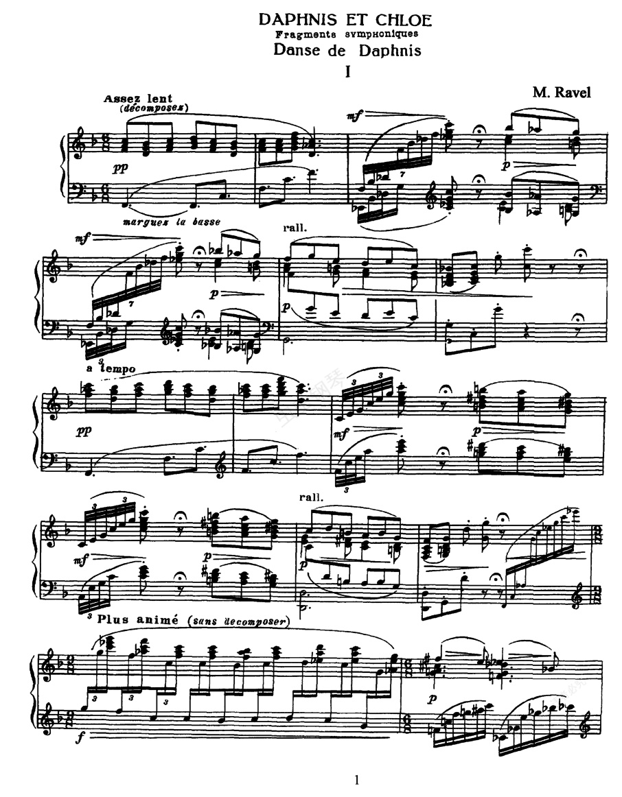 达夫尼斯与赫洛亚 et Chloe - 芭蕾舞剧    《达夫尼斯与赫洛亚》 et Chloé ,又译“达芙妮与克罗埃”(该剧男主角为 ,笔者认为译成女子名“达芙妮”欠妥当),是拉威尔受当时俄罗斯舞剧团团长塞尔盖·贾吉列夫()委托所创作的一部芭蕾舞剧,作于1909-1912年。其剧情是根据希腊作家朗格斯()的田园诗而改编:达夫尼斯与赫洛亚是一对相亲相爱的青年牧羊人和牧羊女,他们从小被遗弃在莱斯博士岛上,被善良的老牧人抚养成人。他们在风景秀丽的山野中相爱,一群海盗突然出现劫走了美丽的赫洛亚,达夫尼斯痛苦万分,向牧神祈祷后得到牧神的帮助从海盗手中夺回了心爱的赫洛亚。舞剧主要描写他们天真无邪的爱情故事。拉威尔这样谈及他的创作意图:“我的意图是构成一幅大规模的交响音画。除了具有古典趣味外,几乎接近于十八世纪末法国画家表现的绘画趣味,也忠实于古希腊梦想。此作以极严格的调性计划为基础,其发展是为确保作品能雷同于交响曲,所以才由少数动机构成。”作品于1912年6月8日在巴黎首演,首演时由于音乐过于复杂,效果平平。后来,拉威尔从中选出几段音乐组成两套专供音乐会演出用的组曲,获得了很大成功。其中,以第二组曲为最佳,在世界上也最为著名。    全剧配乐共分成三部分:    第一部分,在牧神与森林女神的祭坛前。在序奏达夫尼斯的主题后,有一段在祭坛前跳的宗教舞蹈,达夫尼斯与赫洛亚上场,年轻女孩围着达夫尼斯,年轻男孩围着赫洛亚,发展成全体的舞蹈。达夫尼斯拦住了放牛的多尔根,阻挠他追求赫洛亚。在小提琴演奏的赫洛亚主题下,为争取到赫洛亚的吻,多尔根与达夫尼斯以跳舞决胜负。先是多尔根,后是达夫尼斯的舞蹈,赫洛亚给达夫尼斯以吻后,与少女们一起退场。达夫尼斯思念赫洛亚,此时柳赛恩想诱惑达夫尼斯,跳起妖冶的面纱舞。海盗主题出现,达夫尼斯担忧赫洛亚,下场去寻找。而赫洛亚上场,在祭坛前被海盗劫走。达夫尼斯回来见到赫洛亚掉在地上的鞋,悲恸欲绝。在夜曲中,三个森林女神上场跳神秘的舞蹈,把达夫尼斯救醒,要他向牧神求助。达夫尼斯见到牧神显灵而匍匐在地。无伴奏台唱构成间奏曲。    第二部分,海盗布立亚克西斯的营地。海盗们跳粗犷的战斗舞蹈,赫洛亚一面向着首领布立亚克西斯求情,一面准备逃跑。但逃跑失败,牧神们上场,大地裂开,出现巨大的牧神幻影,海盗们四散奔走。    第三部分,与第一部分相同,祭坛,舞台后传来合唱,天快亮了,在小鸟歌唱中有牧羊人的笛声。达夫尼斯与赫洛亚相逢而悲喜交集。老牧羊人拉蒙告诉他们,牧神是因为想到自己的爱人西朗克斯,才救了赫洛亚。于是达夫尼斯与赫洛亚为牧神表达爱情的牧笛感动而投入他的怀抱。在祭坛前,达夫尼斯发出爱的誓盟,在赞颂牧神的欢呼声中,年轻的男孩女孩起兴高采烈地跳狂欢舞而结束。    这部配乐后来由拉威尔自己编成两套交响组曲:    第一组曲包括三曲:    1. 夜曲,第一部分森林女神把昏迷的达夫尼斯叫醒的音乐。长笛独奏的主题表示森林女神走了出来。  2. 间奏曲,连接第一、二场的合唱。  3. 战斗舞曲,第二场开头海盗们的舞蹈。    第二组曲也包括三曲:    1. 日出,第三场开头的音乐。  2. 哑剧,拉蒙向两人讲述牧神,两人感激牧神,后为爱情宣誓。  3. 群舞,结尾的狂欢舞蹈。    另有由三首钢琴独奏小品组成的钢琴组曲:    1. 达夫尼斯之舞 Danse de ,F大调,6/8-9/8拍,甚慢板-非常生动的。    2. 夜曲,间奏曲与战斗舞曲, et Danseère ,其中夜曲为降D大调,6/8拍,不过分的慢板;间奏曲为a小调,3/4拍,不过分的慢板;战斗舞曲为b小调,2/4拍,生动粗犷的。    3. 达夫尼斯与赫洛亚的爱之场景 Scène de et Chloé ,B大调,3/4拍,慢板。