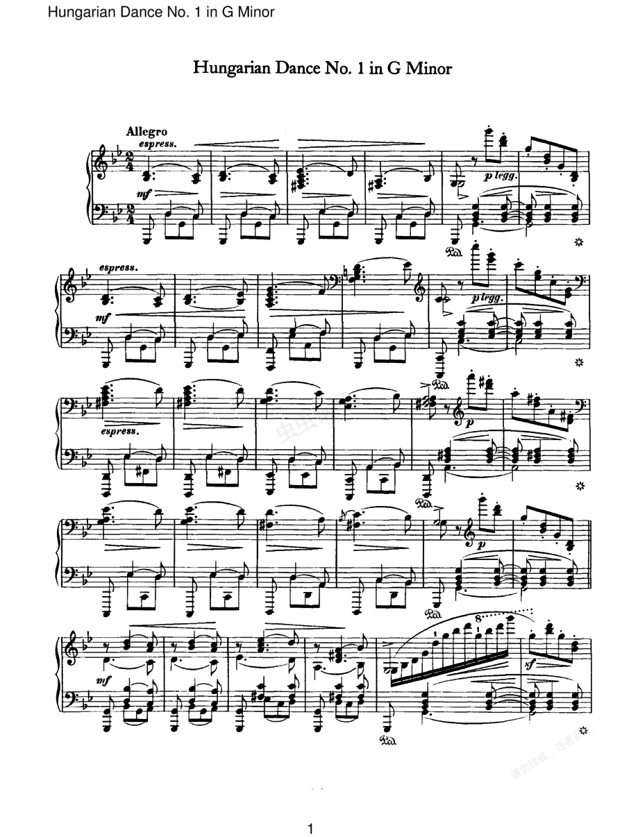 钢琴谱:10首匈牙利舞曲 独奏版(Brahms Hungarian Dance #01 in g (solo))