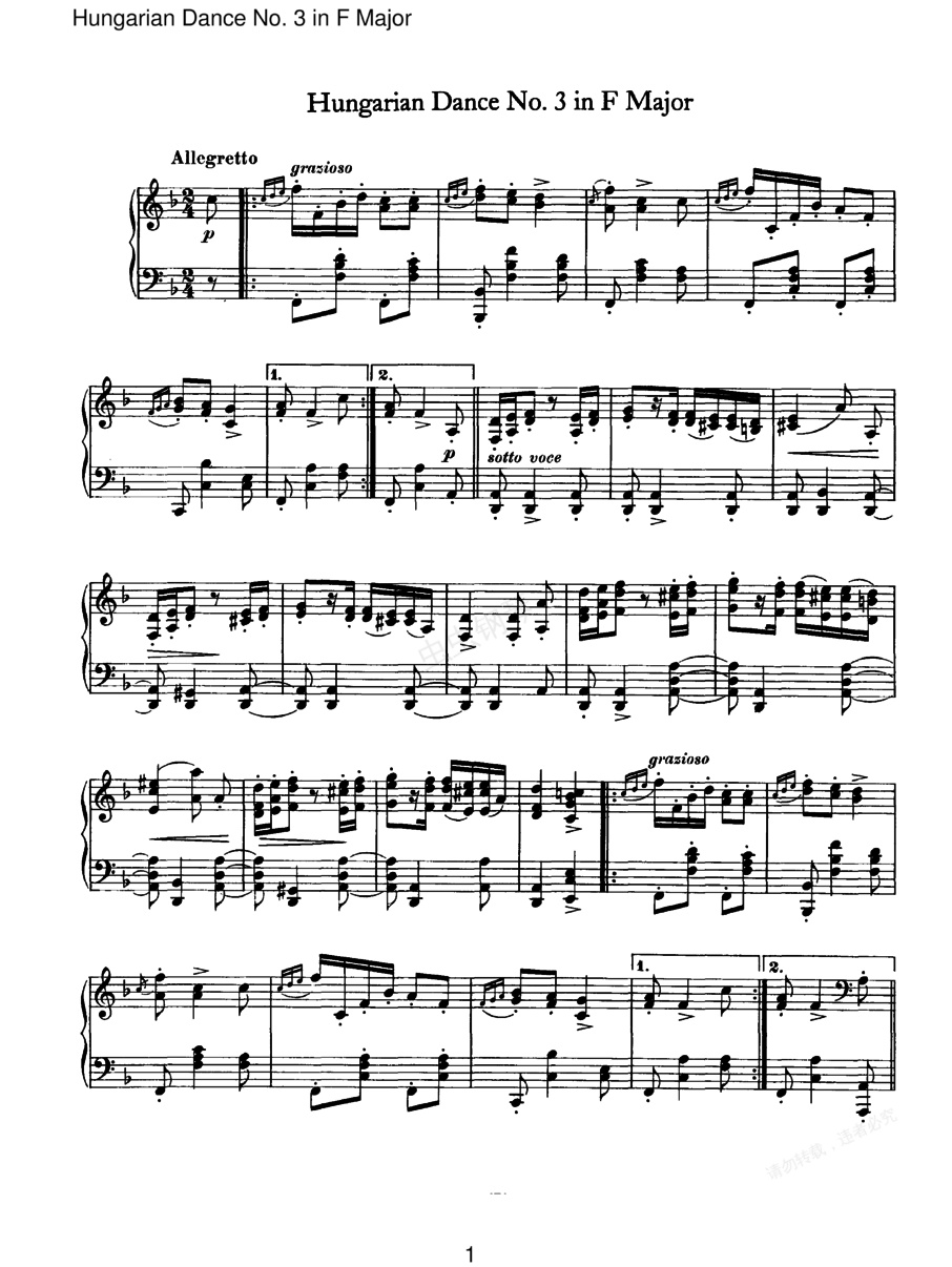 钢琴谱:10首匈牙利舞曲 独奏版(Brahms Hungarian Dance #03 in F (solo))
