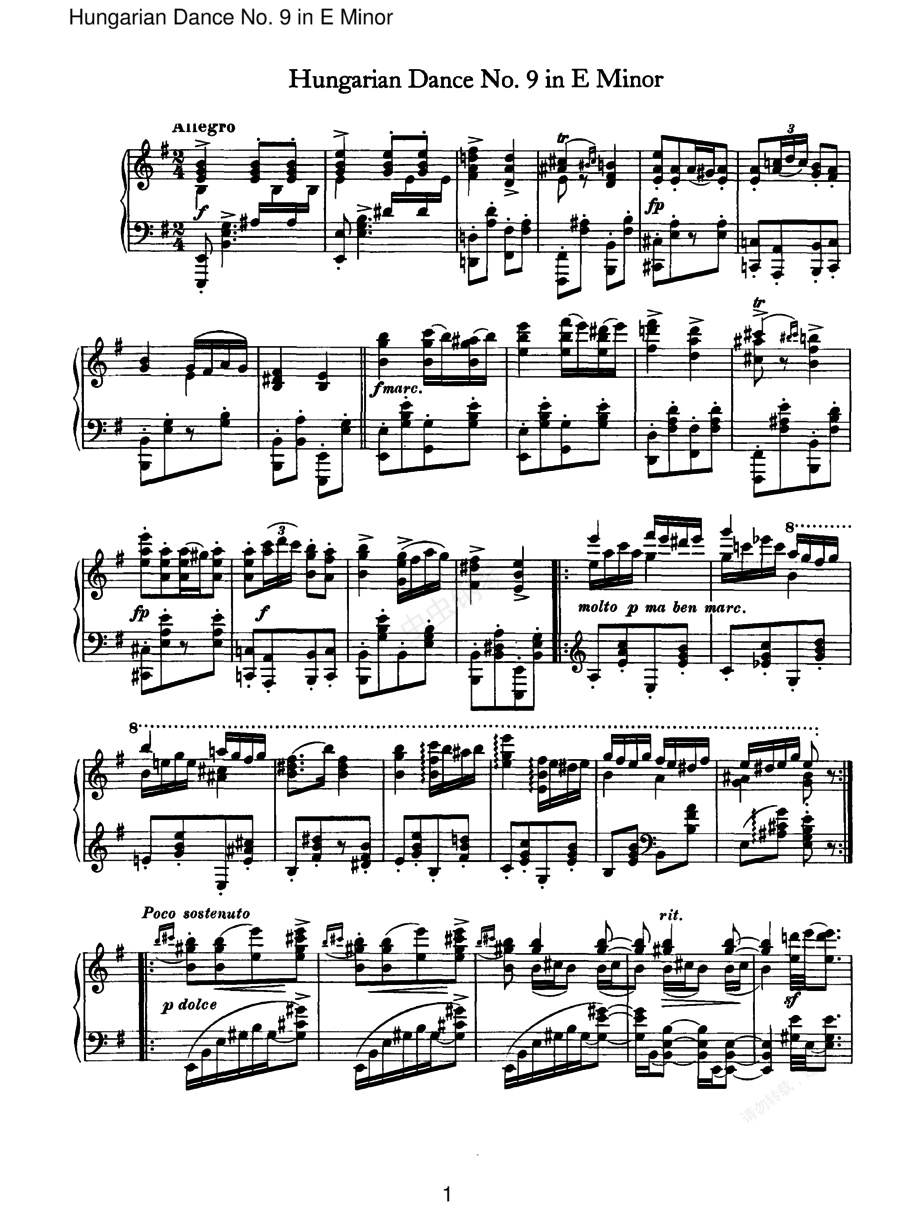 钢琴谱:10首匈牙利舞曲 独奏版(Brahms Hungarian Dance #09 in e (solo))