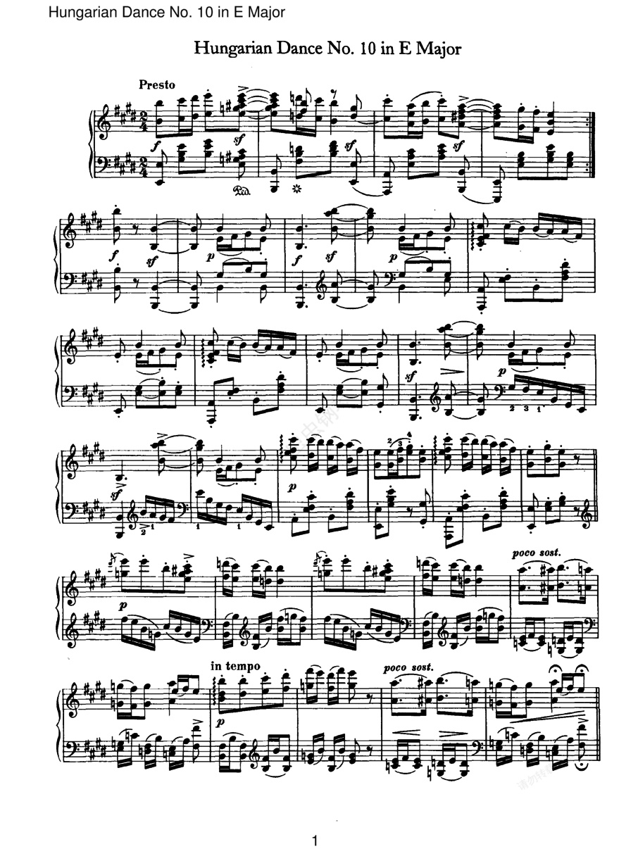 钢琴谱:10首匈牙利舞曲 独奏版(Brahms Hungarian Dance #10 in E (solo))