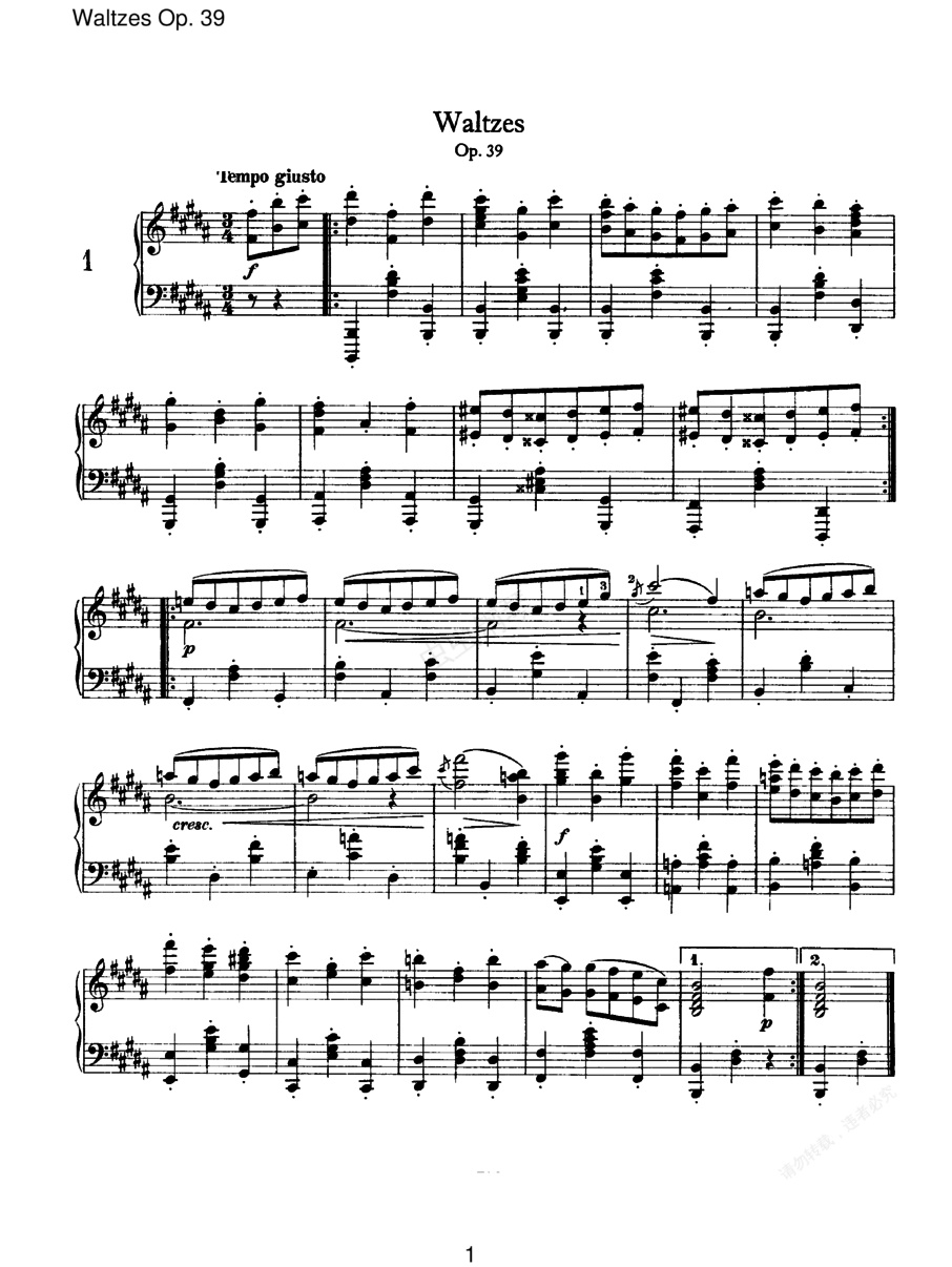 钢琴谱:圆舞曲集(16首)Waltzes Op.39(独奏版 四手联弹版 双钢琴版)(Brahms op039a Waltzes (two pianos)双钢琴版)