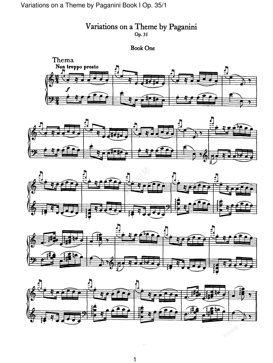 钢琴谱:帕格尼尼主题变奏曲 Variations on a Theme by Paganini Op.35(Brahms op035n1 Variations on a Theme by Paganini Book I)