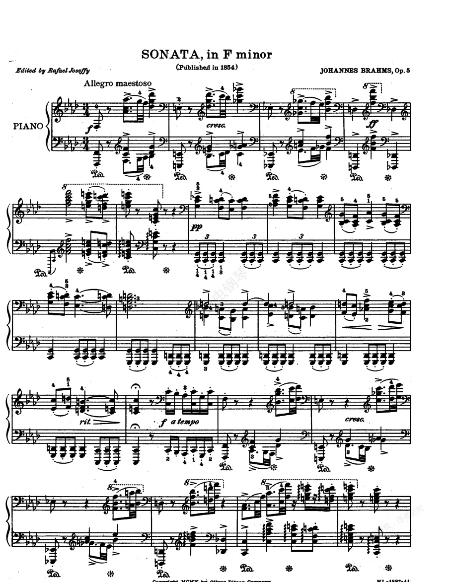 钢琴谱:f小调第三钢琴奏鸣曲 Piano Sonata No.3 in f Minor Op.5(Brahms op005 Sonata #3 in f (Joseffy ed.)版本二)