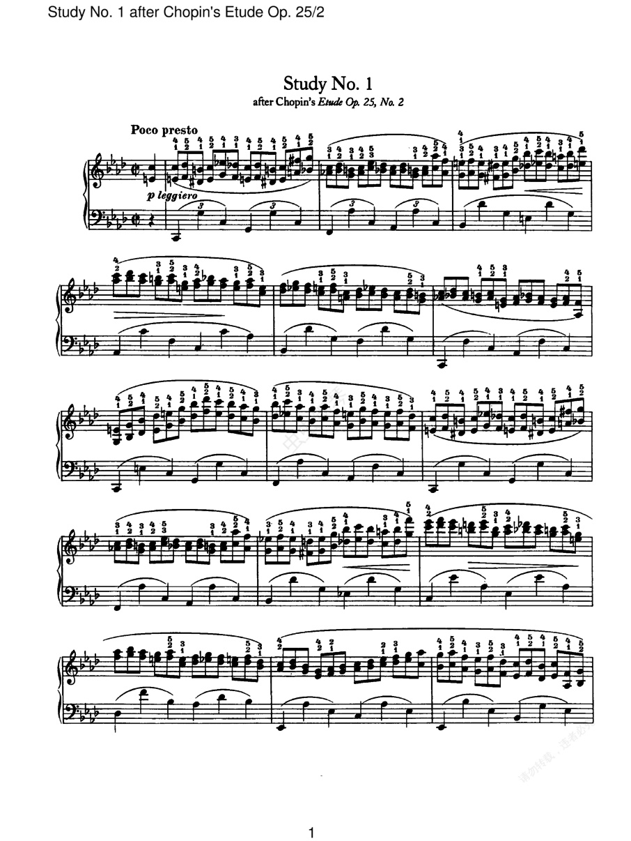 6首无编号练习曲 6 勃拉姆斯为了练习手指曾写过大量练习曲,其中就有根据其他作曲家的作品改编而成练习曲,在保持原作的精神上对技巧提出了更高的要求。 1. 肖邦“f小调练习曲”Study No.1 After's Etude Op.25-2 ,根据肖邦《f小调练习曲》Op.25-2 改编而成,发表于1869年,在原作手指柔韧性练习的基础上加上了流畅的右手六度及三度音型练习。 2. 韦伯“C大调回旋曲”练习曲 Study No.2 After Weber's Rondo Op.24 ,根据韦伯同名作品改编,发表于1869年。 3. 巴赫练习曲(第一稿)Study No.3 After Bach's BWV 1001 ,根据巴赫改编,急板,发表于1879年。 4. 巴赫练习曲(第二稿)Study No.4 After Bach's BWV 1001 ,根据巴赫改编,发表于1879年。 5. 巴赫“d小调恰空”左手练习曲 Study No.5 After Bach's BWV 1016 for the Left Hand ,根据巴赫同名作品改编,发表于1879年。这是一首左手练习曲。 6. 舒伯特“降E大调即兴曲”左手练习曲 Study No.6 After's Op 90-2 for the Left Hand ,根据舒伯特《降E大调即兴曲》Op.90-2 改编,发表于1827年。也是左手练习曲。