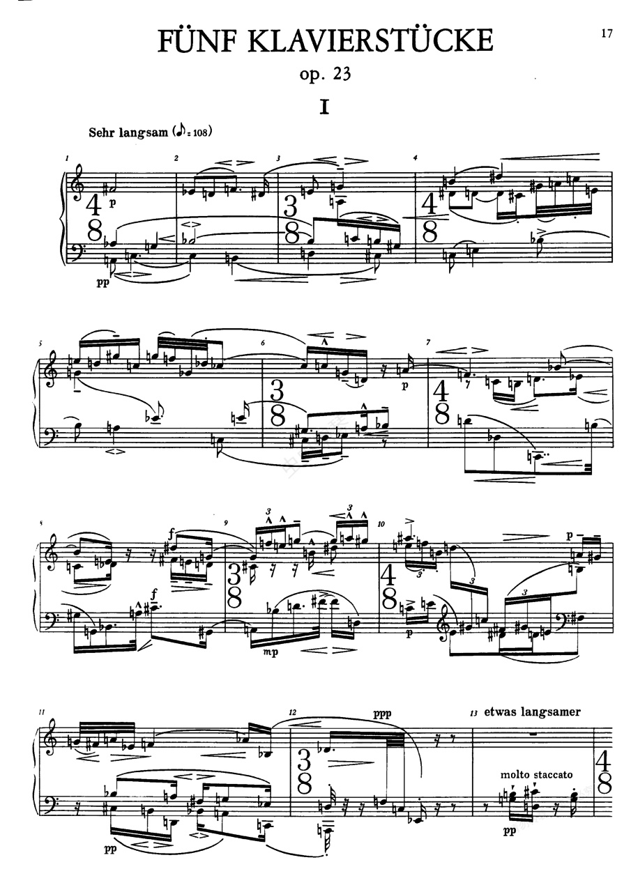 5首钢琴曲 Five Piano Op.23 《五首钢琴曲》Funfücke Op.23 ,作于1924年,这些作品说明勋伯格对他新体系所提供的可能性不断加深的理解。在这些作品中他以更大的机智和自由来掌握他早先作品中的无调性技巧。节奏更尖锐和复杂。其中最后一首《圆舞曲》是勋伯格建立在十二音音列基础上的一首完全有组织的作品,它表明作曲家这时在头脑中确切地形成了十二音创作的基本规则。关于这些乐曲,1934年勋伯格曾写道,“这里我达到一种技巧,我把它叫作‘用音来创作’,这是一个很含糊的词,但它对我是有意义的。就是说:不同于一个动机的通常写作方方法,我几乎以把它作成‘一组基本的十二个音’,我用它来构筑其他的动机和主题以及伴奏和其他和弦――但主题并不包括十二个音。”