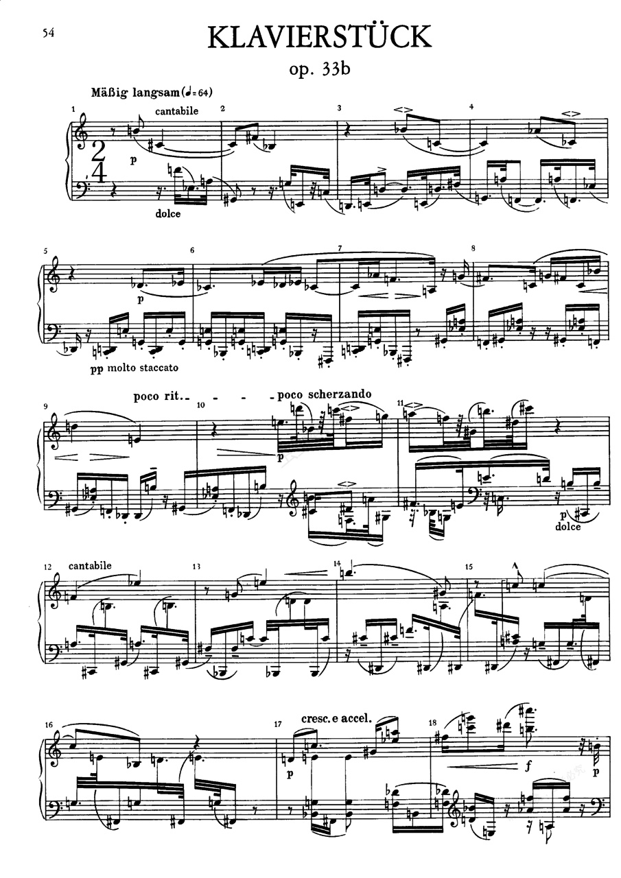 钢琴曲 for Piano Op.33 勋伯格于1923年起开始十二音技术的写作,但在其作品中仍保持了对比、平衡、统一等传统的审美趣味,其作于1929-1913年的《钢琴曲》ücke Op.33 便是其中的精致之作。 这部作品共有两首曲子组成,其中的第一首曲子Op.33a 以六个朦胧的和弦作为第一主题,经过扩展后再次重现,变成十一个和弦。之后是副题出现,其徐徐展开,营造出一种甜美的意境。这种意境不久便被粗暴的低音音响打破。由此进入展开部,以短暂休止符为界,后半部分节奏更加狂乱,之后逐渐恢复宁静。副题也只剩下一阵轻微的回声。待到结尾处,音乐再次激动,最后断然结束在一个凝重的低音和弦中。