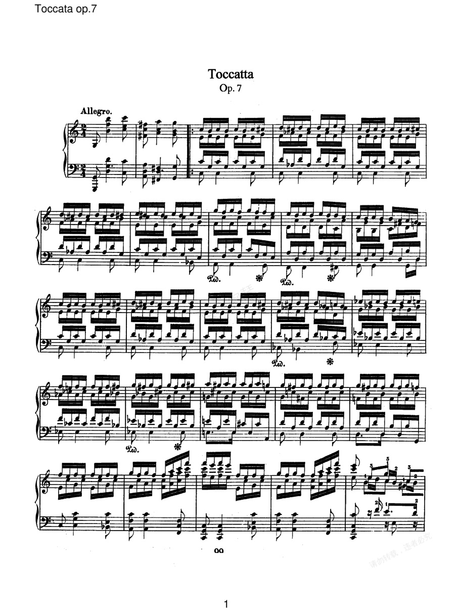 C大调托卡塔 in C Major Op.7 《C大调托卡塔》 in C Major Op.7 ,作于1834年,题献给舒曼密友路德维格•舒恩克() 。C大调,2/4拍,快板。这首作品以及后来的《b小调快板》Op.8 均为炫技性风格作品,虽意味着舒曼已经放弃寻找新路而回到大音乐家阵营里来,事实上在他离开新路之前就已经在酝酿这两首曲子了。 早在1829年,舒曼与莫舍勒斯在海德堡喝得烂醉时就萌发了为克拉拉而作一首炫技曲的设想,他最初是打算创作一首《D大调二重幻想曲练习曲》Etude en 。但后来他完成的却是这首《C大调托卡塔》。从作品中我们可以看到,舒曼将一大堆技巧难题集中在一起,诸如双音、八度音程、重复音符需要快速的手指变化,大跳、圆滑奏和断奏以及ff和pp之间的对比,集中在古典奏鸣曲式的简练、有准则的框架内。这是他的第一首如此规整的作品。