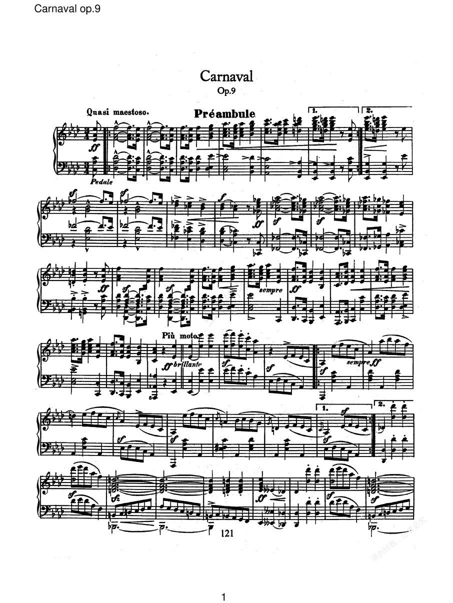 狂欢节 Op.9 钢琴套曲《狂欢节》 Op.9 完成于1835年,这一年舒曼二十五岁。后来在1837年的一封信中,有下面一段关于这首乐曲的记事:“这一系列乐曲,似乎全部是为某一特别的目的而写的……阿什(ASCH)是波希米亚的一个小市镇的名字,在此不但有我在音乐方面的朋友,同时很有意思的是,在我的名字中也有这个字在内()。曲名是日后才附加上去的。” 阿什这个小市镇,位于波西米亚与萨克森的国境的附近。至于舒曼为何要引用这样一个小市镇,后人认为有如下的缘由:1834年春,封·弗立肯男爵把他的女儿埃内斯汀带到莱比锡的音乐教师维克(即舒曼的老师)家里,目的是要他的女儿在此学习钢琴。埃内斯汀当时芳龄十七岁,舒曼曾对她十分有好感,不久两人双双堕入情网,而且还有意结婚。然而,埃内斯汀的父亲不同意这两人结合,最后终于把女儿带回家里。舒曼曾一度离开莱比锡去追寻这位少女,结果未遇而返。此后,这一恋爱经历像断了线的风筝一样,永远消失了。 这部钢琴套曲全名为《狂欢节:四个音符的小场景》 sur notes ,舒曼称之为“较高级的蝴蝶”,共包括二十一首小曲,且每一曲均有标题。音乐中对于弗罗列斯坦、约瑟比乌斯及“即兴喜剧”中的人物:皮埃罗()、阿尔列金()、潘塔隆()、哥伦拜恩()]均加以描述,还有两首迷人的小品献给两位作曲家——肖邦与帕格尼尼,第一首作品惊人地掌握了肖邦夜曲的声音及风格。舒曼的人物刻画也包括当时15岁的克拉拉,称她为“齐娅琳娜”(, 她与1840年与舒曼成婚),以及他当时的未婚妻,刚满18岁的埃内斯汀( von) ,称之为“艾丝翠拉()”。埃内斯汀是作品的关键,她出生于波希米亚阿什(Asch)镇,所以《狂欢节》全曲奠基于四个音符:A音、降E音、C音、B本位音,其德文拼法是:“A, Es, C, H”。《狂欢节》充满创意,每首曲子在艺术上性格互异,整个作品虽充满圆舞曲般的感觉但不会单调。 各首小曲的标题依次为: 1. 前奏曲 Pré; 2. 皮埃罗 ; 3. 阿尔列金; 4. 高贵的圆舞曲 Valse noble; 5. 约瑟比乌斯; 6.弗罗列斯坦; 7. 妖艳的女子; 8. 回答 Ré; 9. 蝴蝶; 10. 跳舞的字母; 11. 齐娅琳娜; 12. 肖邦; 13. 艾丝翠拉; 14. 相认; 15. 潘塔隆和哥伦拜恩 et ; 16. 阿拉曼德圆舞曲 Valse; 17. 帕格尼尼(间奏曲)(); 18. 倾诉 Aveu; 19. 散步; 20. 休息 Pause; 21. 大卫同盟进攻凡夫俗子的进行曲 des "ündler" les。 这一套曲虽然是舒曼最早期的作品之一,却已经显露出这位浪漫派音乐大师超凡的音乐天才。各具特色的二十一首小曲都堪称精品,反映出舒曼在作曲方面的水准。本曲具有相当重要的历史意义,它的问世,在当时不仅仅标志着一种崭新的“浪漫主义钢琴曲”的出现,更表现出作者在艺术方面勇于革新的批判精神。