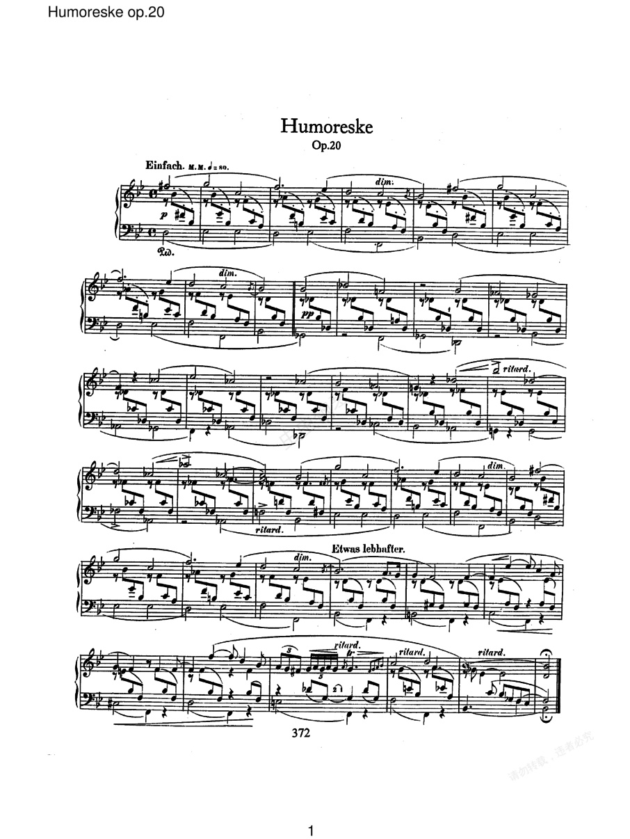 幽默曲 Op.20 《幽默曲》 Op.20 ,作于1938-1840年,舒曼与克拉拉最终结合之前。在作品中,舒曼用特殊的音乐手段诠释自己对幽默的理解。作品为降B大调,4/4拍,朴素的,其中充满了任性伸张、快速音阶跑动、打破小节线的不规则节奏。另一个值得一提的是作品第二部分开头出现的“内在声部”(Inner voice,作曲家要求演奏者在心中唱的旋律),这也许是舒曼之前无人用过的织体。也许舒曼对幽默的理解很大意义上表现了他的充满讽刺和不安的精神世界。就像舒曼自己在创作此作品时说的:“我把整个星期都花在这个作品的创作上,我时而写作、时而大笑、时而哭泣,然而一切都转瞬即逝。”(I have been all the week at the piano,,, and, all at once.)该作品实际上是一系列的情绪画面,借用舒曼自己的方式编织起来,然而又毫不费力的协调一致,从而暗示它们可能被设想为在探索一个主题的变奏曲,甚至是表达某些秘密的变奏曲,没有说出来的大主题只藏在舒曼的脑子里而已。