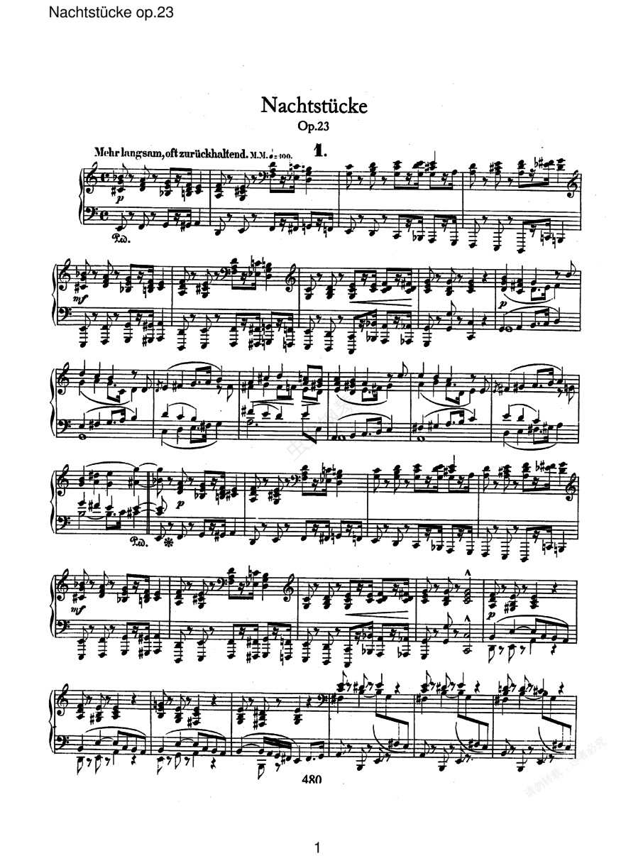 夜曲ücke Op.23 《夜曲》ücke Op.23 ,作于1839年。在致克拉拉的信(1839年4月7日)中,舒曼解释了创作这部作品时的心境: 我告诉你我的一个预感,它从3月24日至3月27日一直缠着我不放,此时正是我全神贯注于我的新曲之时,其中一段总叫我念念不忘,似乎有人从心底里叹息,喊道:“啊,天啊!”。我在作曲时总看到葬礼、棺材和不快活、绝望的脸,我写完之后,在想一个题目之时,唯一来到脑际的就是《尸体幻想曲》。这不是很怪吗?我被自己所作的这部作品感动不已,使得我热泪盈眶,我也不知为何会如此,似乎无法理解。然后来了特蕾莎的信,一切又似乎都迎刃而解了…… 那封信中的消息是,他的兄弟爱德华快要去世了,他赶紧将题目从《尸体幻想曲》改为《夜曲》,再也不将他原先为各首曲子起的名字付诸实施。但在几天后他给克拉拉信中说他从维也纳赶回家时,他清楚地听到几支长号在演奏圣咏,这正是他兄弟断气之时。这四首作品表明作曲家还在一段段地想,想着反复出现的主要主题与对比的插段,虽然在这里他又以他那无穷无尽的才华次第起变化。 1. 原标题“葬礼进行曲” ,C大调的段落短得使第一主题经常地回复。几乎在每一条旋律线上的下行运动中都有进一步的协调效果,还有独立的、如同进行曲般的主要主题本身的下行律动甚至都可被视为克拉拉动机的又一段变奏。在最后四小节所缺少的音符是调性的舒曼手法。 2. 原标题“奇怪的伙伴” ,F大调也维持显著的下行流动。降A大调的第一插段是骚动的主要主题的一个长而使人安静下来的变化过程。舒曼对此特别喜爱,因而在降D大调的中部插段后立即又全部再现上述的变化,只在结尾时以最简洁的手法回到主要主题上来。 3. 原标题“夜宴” ,降D大调生动地配合其拟议中的题目“夜宴”,计划以一段谐谑曲配以两个三声中段,第二个升f小调三声中是此组曲中唯一脱离降记号调者。 4. 原标题“夹有独唱的轮唱曲” mit ,F大调是简单的三段体,继续第一曲的独立的、进行曲般的步法。“轮唱曲”的独唱声部以四个降记号出现在中部插段。