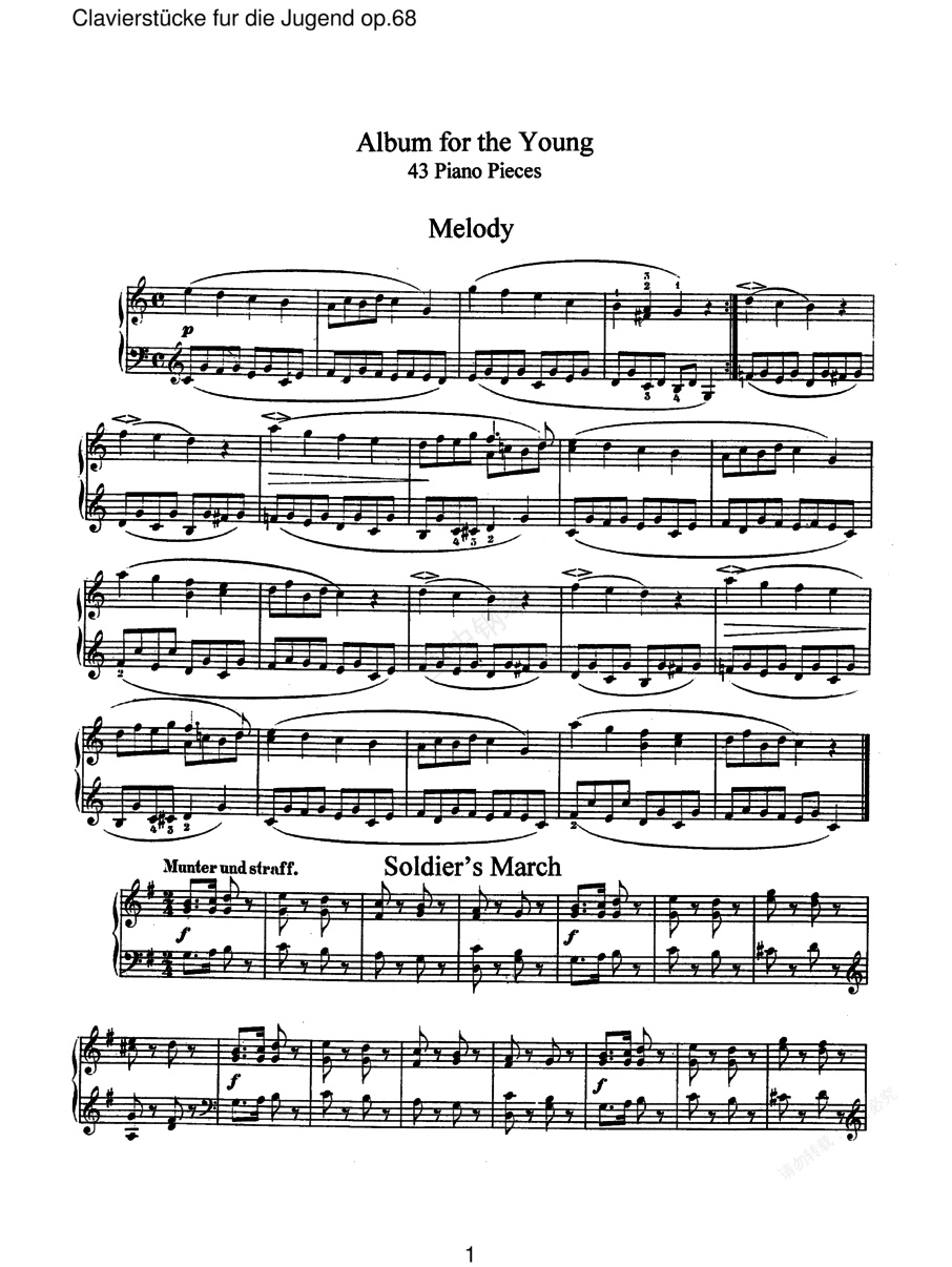 儿童钢琴曲集 Album For The Young Op.68 《儿童钢琴曲集》Album für die Op.68 ,又名《为喜爱钢琴的小朋友们而作的圣诞曲集》,作于1848年,共有43首钢琴小曲组成。舒曼在给友人的一封信中写道:“在写这一曲集的时候,似乎觉得自己已在开始了另一个新的作曲家生活。”。“《童年情景》是属于父母在回忆往事的情形下,为成长的孩子们写的,而这一《圣诞曲集》则是拥有先见的预感,是属于为了孩子们向往着未来而写的”。曲集中的乐曲在创作时,很明显考虑到了使孩子们容易弹奏,在技巧上比较浅易,但这些短小的乐曲每首都有着非常惹人喜爱的旋律。 1. 旋律 ,4/4拍。这是舒曼为了满7岁的女儿玛丽的生日而写的曲子。旋律非常可爱,给人留下深刻的印象。 2. 战士进行曲 ,2/4拍。描写了孩子们在模仿战士,挺起胸膛精神抖擞地向前行进。 3. 无词歌 Trä ,4/4拍,以儿童歌曲风格的旋律写成。 4. 圣咏调 Ein ,4/4拍,平静而庄严的四部合唱。 5. 小曲 Stükchen ,4/4拍,是轻轻开始的幼儿歌曲。 6. 可怜的孤儿 Armes ,2/4拍,描写一个可怜的孤儿孤独地一个人在玩耍的情形,乐曲缓慢地略带悲哀地进入。 7. 狩猎之歌 Jä ,6/8拍,写打猎的情景,猎号嘹亮地吹响,猎狗在飞快的跑着,马也在奔驰。乐曲充满清爽而快乐的气氛。 8. 粗犷的骑士 ,6/8拍,有大家很熟悉的并非常喜欢的旋律。 9. 民谣 ,4/4拍,分三部分,前后两部分是有如倾诉似地,中间部分则是快活的。 10. 快乐的农夫 Frö, von der Zurü ,4/4拍,这是人们非常熟悉的乐曲,流传很广,并被改编为其他演奏形式演奏。乐曲清爽快活。 11. 西西里风格 ,6/8拍,作者的表情提示为“淘气十足地”。乐曲先以弱出现,然后加强力度。 12. 圣诞老人 ,2/4拍,在乐曲中好像看见了飘着又长又白的胡子的圣诞老人,坐在雪橇上在银白色的雪地上飞驰,然后进入烟囱的形象。音乐以强音并非常清晰向上的旋律开始。 13. 可爱的五月 Mai, Mai ,2/4拍,乐曲中充满了五月的阳光,使人联想到春天的美好时光。以明朗而充满希望的旋律开始。 14. 小练习曲 ,6/8拍,这是为孩子们写的练习曲,只有一串串的分解和弦,作者提醒要轻轻地近可能地演奏。 15. 春之歌 Frü ,6/8拍,这是一首优美的歌曲,必须急促地演奏。 16. 第一次失落 ,2/4拍,描写因失落了心爱的东西而哭泣的孩子。 17. 小浪子 ,2/4拍,乐曲的开始是强有力的,到结束时力度已经逐渐减弱至很弱了。 18. 割草歌 ,6/8拍,悠闲的旋律用弱的力度慢慢地唱出来。 19. 小浪漫曲 ,4/4拍,从这里开始为本曲集的第二部分,作者标记有“为了年纪稍大的儿童”的字样。乐曲开始用两手的齐奏奏出浪漫风格的旋律,和弦填满了其间的空隙。 20. 乡村之歌 Lä Lied ,2/4拍,无忧无虑的描写乡间景象的旋律,给人以清新的感觉。 21. ★★★ ,4/4拍,乐曲是由慢而富于表情的旋律构成。 22. 回旋曲 ,6/8拍,旋律是温和优美的,主题以中庸的速度奏出。 23. 骑士ücke ,6/8拍,乐曲用明晰的节奏描写了骑士的形象。其中有各种各样的步伐。 24. 收获 ,6/8拍,乐曲中充满了收获时的喜悦,以快乐的表情演奏。 25. 戏院余韵änge aus dem ,2/4拍,乐曲用急速的速度演奏,其中有明显的力度变化。 26. ★★★ ,4/4拍,流畅的旋律用较慢的速度优美地奏出。 27. 卡农 ,2/4拍,主题慢一小节在左手呈现。 28. 回忆 ,2/4拍,在标题下面写着“1847年11月4日,菲利克斯•门德尔松的忌辰”。乐曲用较慢而如歌似地演奏。 29. 外国人 Mann ,2/4拍,旋律中的音是很强的,使人会联想到一个强壮的男人,中段有转调,后又回到开始,最后有尾奏。 30. ★★★ ,4/4拍,是浪漫风格的曲子,旋律非常缓慢地以弱力度奏出。 31. 战歌 ,6/8拍,乐曲的主题强有力地以强奏开始。 32. 天方夜谭 ,4/4拍,非常优美的旋律极缓慢地轻轻地奏出。 33. 摘葡萄时的快乐ö Zeit! ,2/4拍,轻快的旋律极富于跳动性。 34. 主题 Theme ,2/4拍,乐曲中的每个声部都是一首非常生动的乐曲。 35. 迷娘 ,4/4拍,用缓慢柔和的表情奏出惹人爱怜的旋律。 36. 意大利水手之歌 Lied ,6/8拍,是拿波里民谣风的乐曲,由二小节缓慢的序奏进入,然后出现的主旋律加快速度。 37. 水手之歌 ,4/4拍,像是在描写平安温馨的冬天,乐曲以弱奏缓慢开始。 38. 暖冬 I ,4/4拍,乐曲采用极缓板轻轻地开始,是平静的冬天。 39. 严冬 II ,2/4拍,是严酷的冬天,和前一种冬天形成鲜明的对比。由小调开始,然后加上各种速度变化,最后在大调结束。 40. 小赋格曲 Fuge ,2/4拍,前奏部分由三声部写成,之后呈现活泼的赋格曲,速度不太快地奏出。 41. 北欧之歌 Lied ,4/4拍,标题下有括号(对G的问安)。G是指挪威作曲家尼鲁斯•威廉•葛德(1817-1890)。作者有民谣风的提示,乐曲的旋律是朴素的。 42. 带装饰的圣咏调 ,4/4拍,在圣咏调的基础上加进了装饰。 43. 除夕之歌 ,4/4拍,以中板速度奏出有亲切感的旋律。