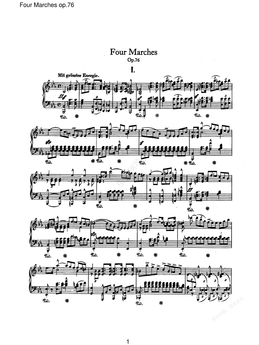 4首进行曲 Four Op.76 1844年,舒曼一家从莱比锡迁至德雷斯顿,1849年5月,德雷斯顿的日常生活被革命所破坏了,舒曼在6月回到德雷斯顿时,到处都是普鲁士士兵,因此他将自己的愤怒全部发泄在了《四首进行曲》Four Op.76 中,他要求立即出版这几首曲子,并且将标题命名为“德雷斯顿1849”,虽然这个意见最后没有被采纳,但在舒曼的好友中都知道这部作品为“防御进行曲”。 这部作品中的四首乐曲的调式分别为:降E大调、g小调、降B大调、降E大调,这表明舒曼仍把它们视为一套组曲,并且这四首进行曲都是三部曲式的,中段的风格比较流畅,但与前、后段之间并无过于尖锐的对比。其中第4首的中段具有非常有特色的迅速的远关系转调,调性从降E大调突然转到B大调上,这种迅速的远关系转调也是舒曼作品的一大特点,在他的其他作品中也常常可以见到。事实上,这部作品里所有的中段都在向人们展示一个比“进行曲”的英雄气质更为精彩的舒曼形象。在常见的节拍下面,舒曼悄悄的使用了各种具有独创性的节奏型,这种办法使得作品听上去热血沸腾而又不会显得过于张扬,同时拥有一种内在的力量!克拉拉对它们的看法是“流行的进行曲,庄严是其特色,极为辉煌和有独创性。”
