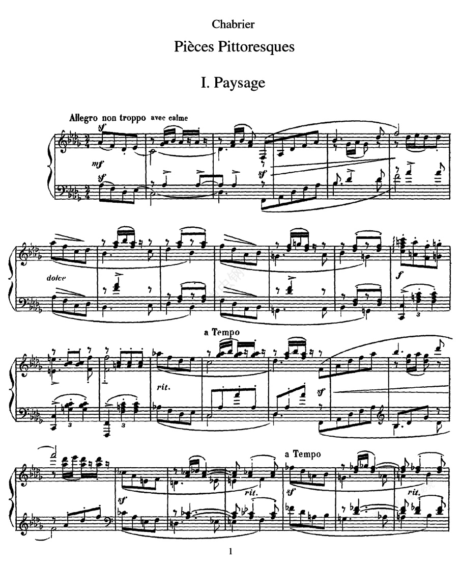 10首绘画性小品 《十首绘画性小品》Dix 是由夏布里埃创作的钢琴小品集,由10首有独立标题的小曲组成,在他创作的钢琴作品中是最为著名的。初演后评论家们称:“我们似乎已听到了某种不同寻常的音乐,这音乐使我们的时代与库普兰和拉莫的时代拉得更近了。”这说明夏布里埃的作品中拥有十八世纪的音乐风格。另外,夏布里埃在这十首乐曲中选出《牧歌》、《乡村舞曲》、《树荫下》、《谐谑圆舞曲》这四首改编成管弦乐曲,并冠以《田园组曲》之名。 1. 风景 不太快的快板,降D大调,2/4拍,三部曲式。首先是以快活的情绪开始,像一个人在迈着轻快的步伐哼着优美的歌调。中段在A大调,不断地做简洁的主题反复和多次的转调,与前后两段形成对比。其切分节奏暗示着轻快的步伐和情调。 2. 忧虑 充分的中板,G大调,9/8~6/8拍。乐曲中在上声部的旋律部分与其他声部有机的结合,给人一种荒凉秋夜的感觉。其创作手法简洁,但无比巧妙而有效的表现出微妙的情感。 3. 疾风 热烈的快板,D大调,3/4拍。这是一首情绪强烈的乐曲,主题用强烈的齐奏像旋风般忽然涌出。 4. 树荫下 小行板,C大调,2/4拍。评论家柯尔托形容此曲像:“轻轻摇晃的树叶,随着轻微涟漪缓缓流动,在绿色树荫下晃动的阳光的嬉戏,和听不到的大地之音,寂静盘踞在夏日天空下的数目神圣的寂静。” 5. 摩尔风舞曲 中板,a小调,3/4拍。乐曲中充满着幻想风格的变化莫测的乐思,有像整齐步伐一样的节奏,和以三度音程蓬勃有致的婆娑起舞的旋律。 6. 牧歌 小快板,E大调,4/4拍。此曲中使人陶醉的旋律朴实无华,由像大管的低音音色和单调反复的单音的内声部所形成。这一旋律反复多次给人留下深刻的印象。有人认为这是夏布里埃《绘画性小品》中的杰作。 7. 乡村舞曲 Danse 坚毅的快板,a小调,2/4拍。这首乐曲的主题是充满乡村舞曲式的特性,在主题下面低音声部发出笨拙的伴奏。中间部在A大调以略带诙谐的节奏,构成了鲁莽而粗犷的风格。 8. 即兴曲 小行板,降B大调,6/8拍。柯尔托说这首乐曲有“在夏布里埃的才能里面所含有的近似舒曼的表现方法。”曲中拥有拍子变化自然、和声变化大胆等“即兴”性。 9. 华丽的小步舞曲 快板,g小调,3/4拍。乐曲由于节奏强音的变化多样,因此区别于传统性的小步舞曲。在G大调的中间部分含有的幻想调性美,这是夏布里埃所独有的。 10. 谐谑圆舞曲 生动地,D大调,9/16拍。这也是本曲集最为著名的乐曲,需要用非常精细和纯熟不造作的演奏技巧来表现。它色彩鲜明,音乐富于幽默感,处处体现出谐谑曲节奏明快、情绪热烈与圆舞曲旋律流畅、格调优雅的特点。