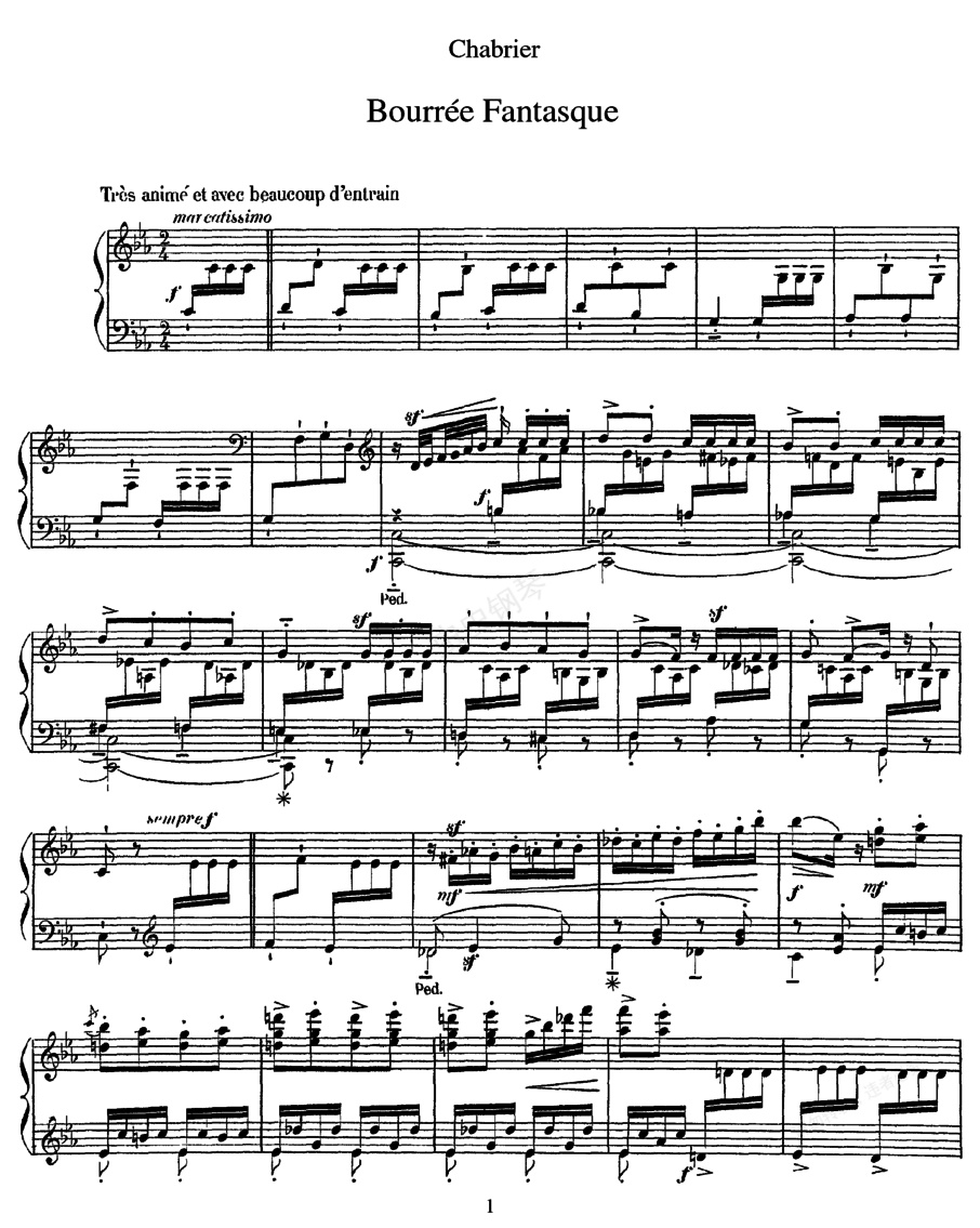 幻想风格布列舞曲 《幻想风格布列舞曲》 ,作于1891年,题献给钢琴家爱德华多·瑞斯勒()。柯尔托认为,该作品改编成乐队演奏能更好的表达作曲家所要表达的狂热及激情。作品为c小调,2/4拍,以一个精力充沛的西班牙主题开头,紧接着的是一段抒情的旋律,随后这两个主题结合在一起。实际上,夏布里埃留下了这首作品的部分管弦乐版手稿。但现今最常演奏的乐队版则是由他的朋友,德国指挥家菲利克斯·莫托(Felix Mottl) 所改编的,另外查尔斯·柯什林() 改编的版本也经常被演奏。