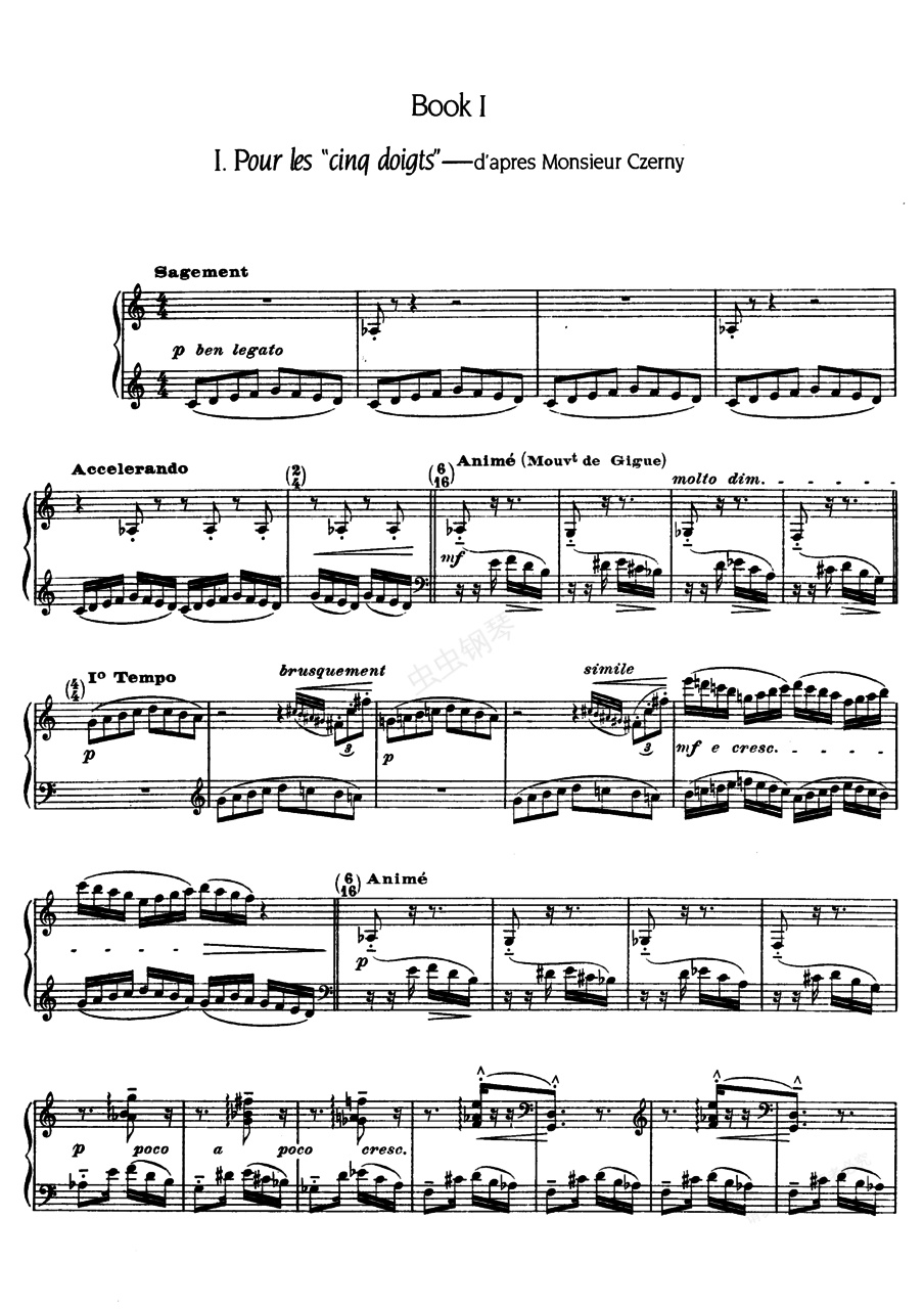 12首钢琴练习曲 12 For Piano 1914年爆发的第一次世界大战使德彪西陷入困惑,此时对他来说,就连钢琴的声音也变得“令人憎恶”。在第二年的前几个月里,德彪西忙于为他的出版商迪兰德编订肖邦的练习曲,正是这个暑假,产生自己写一些钢琴练习曲的想法,1915年夏天,德彪西离开家人,独自住在位于普尔维尔的一音别墅,狂热地进行着这项工作,普尔维尔是个风景宜人海滨浴场,靠近迪耶普。德彪西在这里还完成了他的另外两部作品,《大提琴奏鸣曲》和《为长笛、中提琴与竖琴而作的奏鸣曲》。 此时德彪西的创作感觉已超越了他所选择的艺术体裁,他在给迪兰德的信中,选用了最美好的词汇用以编到他成功的喜悦。他写到:“我非常喜爱这些练习曲,并对它们的未来充满信心。”“坦白地讲,我很得意写出这样一部作品,它必将占有特殊地位,这绝非出于虚荣的夸张,这些练习曲中的技术难点对钢琴家们将是非常有用的训练,并使他们懂得,只有强有力的手才能拉开音乐之门。”“与这些乐谱中的某些部分比较起来,最精致的日本彩印画就像是孩童的把戏,令我欣喜的是这不作品完成得如此漂亮。” 对于如何编排这些乐曲,德彪西不太肯定,他将全部练习曲分成两集,每集6首。最初他是按速度的快慢区分的,但最后决定,第一集按特殊的技术问题排序,第二集则按调性排列并考虑音乐的一致性。再将此作题献给库普兰还是肖邦的问题上,德彪西一直踌躇未决,最后他选择了肖邦,并附加了一句简短的引言——"令人钦佩的钢琴家"。德彪西在向出版商解释为什么他的钢琴练习曲没有标记指法时诙谐地说:“不标记指法本身就是一种绝妙的练习。” 德彪西的《十二首钢琴练习曲》12 For Piano 于1916年6月出版,在此之后的几个月没有人将其全部演奏,首次部分地演出也没有引起人们的足够重视。1916年12月21日,钢琴家乔治•科普兰在纽约艾奥利亚音乐厅演奏了该曲集中的第10、11首练习曲。同年12月14日在奥尔洛夫斯卡伯爵夫人的沙龙音乐会上,由德彪西的朋友德裔美国钢琴家瓦尔特•鲁梅尔演奏了另外4首练习曲。这部作品一直没有得到钢琴家们应有的重视,直至第二次世界大战后,由于梅西安着意指出它所具有的现代性,这部作品才被广为人知。 目录: 第一集 车尔尼先生之后的《五指练习曲》 为三度音程而作 为四度音程而作 为六度音程而作 为八度音程而作 为八个手指而作的练习曲 第二集 为半音阶而作 为装饰音而作 为重复音而作 为对峙的音响而作 为复合琶音而作 为和弦而作