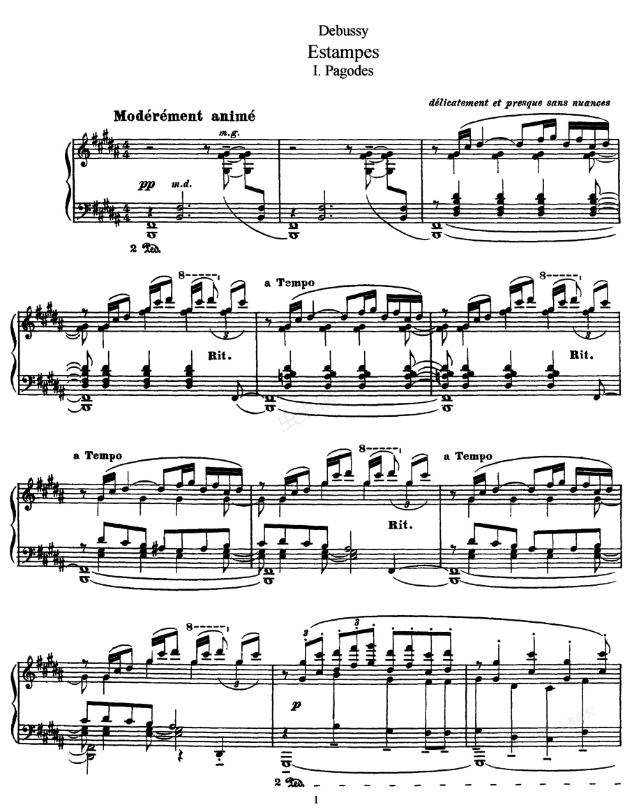 版画集 德彪西的钢琴套曲《版画集》 ,作于1903年,为法国作曲家德彪西在钢琴领域奠定印象派技法的里程碑之作。德彪西由此进入了兴盛的丰收期。周所周知,比起管弦乐,德彪西在钢琴上成就更伟大。他大大拓展了钢琴音乐的表现力,也大大丰富了钢琴音乐的曲库,这批作品至今仍以含蓄的魅力、雅致的意境而令听众痴迷。《版画》以三首小曲组成。 此钢琴套曲共包括三首: 1. 宝塔 ,从中国音乐中获得的灵感,用五声音阶来表达钟声的效果。在传统的两声部(一个主题一个伴奏)上,又扩充出两个声部。七和弦与五声音阶音程使旋律如入烟云之中,清新而秀美,颇具中国神韵。在自然表情发展中,浓与淡、庄与谐、虚与实的对对比俯拾皆是;高潮处五光十色,婉转处暗香浮动;最终,乐曲如潺潺流水般消逝......大有绕梁三日之感。 2. 格拉纳达之夜 dans ,是一幅西班牙民间风俗画。据称作品的素材来自拉威尔。格拉纳达是西班牙南部的一个城市,描写夜幕降临,有曼陀林声从远处传来,有哈巴涅拉舞曲的节奏,表现出西班牙后巷夜市酒场的气氛,有浓烈的西班牙气息。可以边听边想像着一位异邦游人来到格拉纳达,迷人的景色、热情的人民、丰盛的宴会,令其沉浸其中;一瞬间夜幕降临,自己该离开此地,不由产生一种依依不舍。狂欢的舞蹈渐渐远去,只留下游人依旧孤独。可以说,这首曲子固然短小,但任谁聆听都会永生难忘。 3. 雨中花园 Sous La Pluie ,早于1894年即写成,曾为四首《意象》作品中的一曲(未出版)。乐曲以两首古老的法国民歌为素材,通过雨、云、阳光、晴空的瞬息变幻,逼真地描绘了法国的田园景象以及孩子们天真烂漫的形象。人们可以联想到孩子们在花园里游戏,一阵从远而近的暴风雨袭击过来,孩子们逃散了;最后雨停了,孩子们又高兴地继续游戏。人信也许会这样联想;午睡时,孩子们在母亲的催眠工声中进入梦乡,沉闷、灼热的空气弥漫在巴黎上空,不久,细细的雨点从天边洒下,远处响起一声雷鸣,暴风雨来临了。小树靠着墙和穿台射身呻吟,孩子们惊醒了,母亲唱着歌抚慰他们,他们附和着。但一个突如其来的响雷淹没了他们的歌声,于是母亲唱起了另一首歌《我们不再回到森林去,月桂树已砍倒》,尽力缓和恐惧的气氛。随着最后一个闪电和远去的雷声,暴风雨停息了。从害怕中解脱出来的孩子们兴高采烈。窗外,雨过天晴,彩虹万里。光芒四射的太阳露面了,它为战胜暴我雨而欢笑。