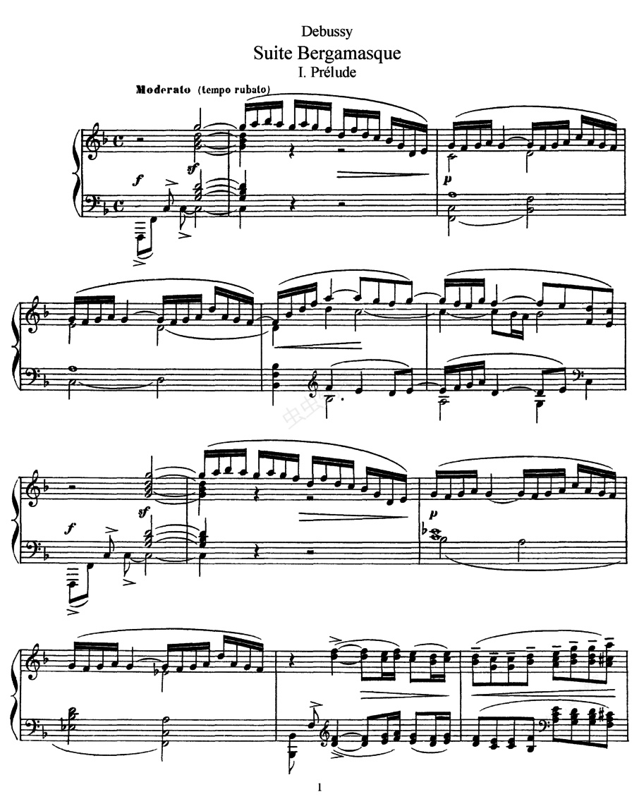 贝加摩组曲 Suite    《贝加摩组曲》Suite 是德彪西的早期作品,由四首小曲组成,完成于1890年,但直到1905年才出版,前后历时十五年,可见这一组曲的写作经过了相当长时间的推敲。这一组曲不但旋律优美,而且运用了色彩极其丰富的和声,显示出德彪西已逐渐走向他自己所创立的“印象派”,是德彪西那独特的个性逐渐进入成熟时期的过渡性作品。组曲的曲名来源于德彪西留学意大利时,对意大利北部贝加摩地区的深刻印象。    1. 前奏曲 ,F大调,4/4拍,中板。以“前奏曲”作为开头,这是有点过时的手法,基本上回到了《两首阿拉伯风格曲》的形态,甚至其主题与其中第二首在主题上有某种程度的近似。还有一两段颇似格里格的模进手法。    2. 小步舞曲 ,a小调,3/4拍,小行板。倏忽不定的梦幻意境在织体的支持下,更加飘忽悠然。同时,靠调式上的特征,使a小调的单一调性得以保持绝对流畅,传统和声的进行也将不发生更多作用。主和弦本身极少相遇。在结束部分,它在片断的一些节奏中运用屏息式的触键法使得魔鬼般的“刮奏”消灭在黑暗中。    3. 月光 de Lune ,降D大调,9/8拍,很有表情的行板。这是德彪西的钢琴作品中最为大众化的一首,美丽的旋律暗示了对月光的印象,甚弱和弦的反复更加深了这一印象。接着速度轻快的琶音描写了月光闪烁的皎洁色彩,仿佛置身于晴朗而幽静的深夜氛围之中……它所运用的和弦连续进行,对德彪西以后的作品已具有初步的典型意义。    4. 帕斯比叶舞曲 ,升f小调,4/4拍,不过分的小快板。这是德彪西至此更为接近古钢琴风格的作品。它是一首动人的乐曲,其中交织在一起的沉思与欢乐约占有同等的篇幅。德彪西虽然不能完全拜托那种在最后一个和弦上省略小三度的用法,但这里的最后十小节充分使用了空五度的进行,从而使短小的尾声具有一种明确而有预示性的音调。