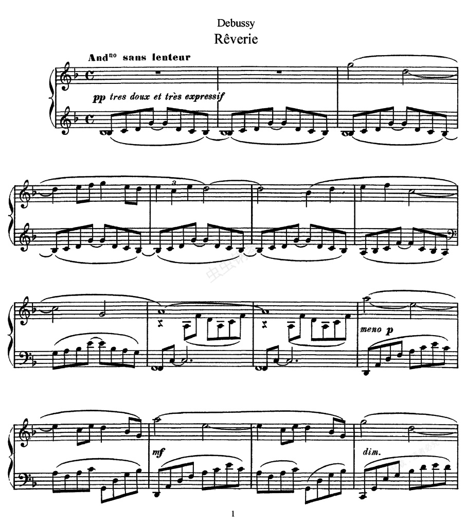 梦幻曲 《梦幻曲》 ,于1890年出版,但时间确实要更早些,因为在它即将出版的时候,德彪西曾给出版者弗罗蒙特写过一封信: “我对于你决定出版一事表示十分感谢……这首作品是几年前在匆忙中完成的,纯粹从物质方面考虑得多些。它是一首无关重要的作品,我坦率地表示,它绝对是不成功的。” 但这首作品还是有它的拥护者,并且有些地方还富有情趣。调性一开始就含糊不清,F大调的旋律浮动在持续下属音上方,分解和弦的伴奏声部以一股强有力的进行推向上主和弦。调性悬而未解的感觉,十分适应一种梦幻概念的需要(只是在第9小节到达主和弦后,方无双关意味),而这种或多或少由调试模糊而产生的效果,使人又想起福雷的风格。但进行持续不久,马上又像是进入了鲍罗丁与此同类的作品中。