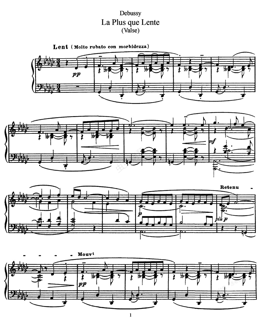 甚慢板圆舞曲 Valse "La Plus Que Lente" 在《前奏曲》第一集问世后不就,德彪西在1910年还创作了一首非常短的降G大调小品《甚慢板圆舞曲》Valse "La Plus Que Lente" 。“圆舞曲慢板”在当时是一种非常流行的沙龙风格,而在德彪西稀奇古怪的笔下,竟把“更为缓慢些”写得胜过了此类的其他任何作品。德彪西把原稿交给了里奥尼(Leoni),他是巴黎新卡通大饭店吉普赛提琴手,为这首作品他无疑是从那里取得了素材。斯奇密兹强调它具有严肃的意义,因为他创作的目的是为了一般的听众,对现代的听众来说,大多喜欢听一种特殊而带一点浅薄意味的音调。
