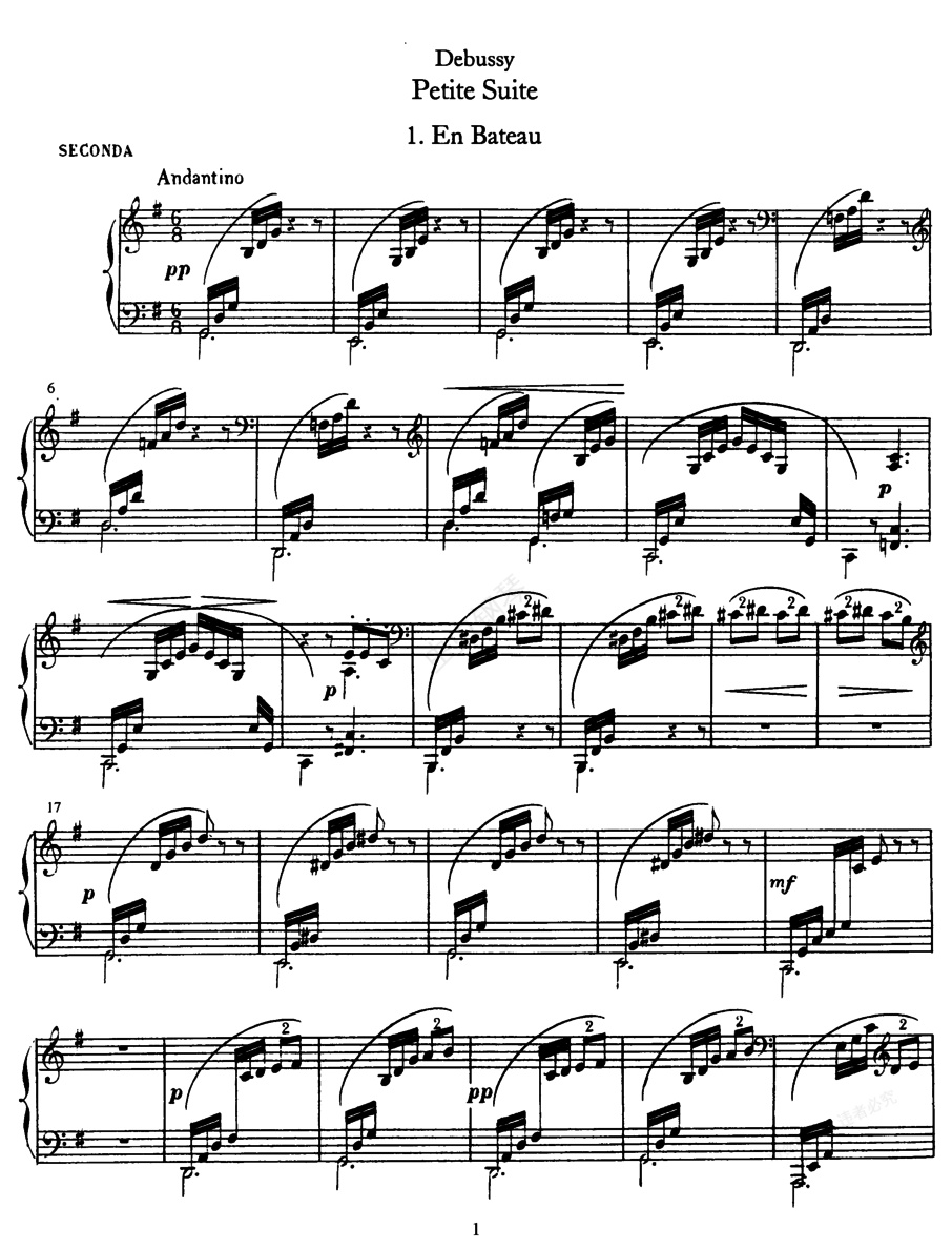 小组曲 Suite - 四手联弹 《小组曲》 Suite 是一部钢琴四手联弹作品,作于1889年。这部作品是在魏伦《被遗忘的短歌》 这首诗完成后不久创作的,这首组曲与他那些值得重视的歌曲之间有着鲜明的对照,几乎被认为是出自另一人之手。他的这一作品还曾得到海里•布赛尔(Herri)的帮助为它改编成管弦乐曲,流行范围甚至超过了两首《阿拉伯风格曲》。这部作品还被誉为是底里比斯的灵感再度主宰着德彪西的天才。 1. 在船上 En ,G大调,6/8拍,小行板。精致的分解和弦的伴奏声部上方流动着一条旋律,这种二重奏的技巧与福雷的《洋娃娃组曲》中的第一首《摇篮曲》相近似,但福雷的这一作品早在前几年即已完成。中间乐段结尾处有一段不长的经过句,预示着两种方法:第一是全音音阶的用法;第二是由十六分音符组成的小音型由第二钢琴担任,这与他后来惯用于象征水中的波纹、漩涡以及急流式的手法十分相似。 2. 行列 ,E大调,4/4拍,中板。曲中有着优美的摇摆节奏,甚至以少许钢管乐的吹奏架势不时予以渲染,有些地方则运用声部的重叠增加气氛,一些转调也处理得很出色,特别是表现在中间乐段的结尾处。 3. 小步舞曲 ,G大调,3/4拍,中板。可以看作是这部作品的精华所在。指法优美、轻快,声部安排得十分紧凑,内声部尤为显著。全曲精致、完整,在德彪西这一时期的钢琴音乐中是很罕见的。此曲一开始以精灵般的笛音与号声作为暗示,乐曲运用力度从P减弱到PPPP的手法,使具有魔术般的变幻消失在结束处,仙境般的号角召唤回声,微弱地围绕着主导旋律,多少暗示着度德彪西钢琴音乐在他奇异的幻梦世界里已经寻找到了归宿。 4. 芭蕾舞曲 ,D大调,2/4拍,优雅地。作品中不带夸张手法,令人回想起他的《幻想风格舞曲》。中段是圆舞曲,不管怎样,还是属于风靡全世界的法国舞剧音乐范畴。