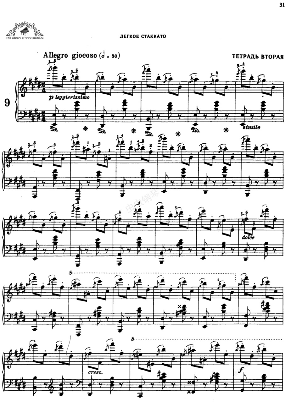手指灵巧练习曲 The Art of Op.740 《手指灵巧练习曲》The Art of Op.740 是车尔尼钢琴练习曲库中极为重要的一本教材,总体上偏重于技巧的训练,既有基本技术的练习(如音阶、琶音、和弦等),又有各种专门技术的训练(如八度、双音、震音、颤音等),在学习中要针对每一条的学习重点,运用科学、合理的练习方法,提高练习效率,在以前学习的基础上进一步训练手指、手腕、手臂之间的协调配合动作,逐步掌握各种专门技术,加强手指的灵活性。 本练习曲集共五十首练习曲: 第1首C大调左右手五指练习,手指的平均动作练习; 第2首G大调左右手琶音练习,大拇指从下面经过的练习; 第3首D大调右手五指练习,决速清晰的训练; 第4首降B大调右手三度练习; 第5首降E大调左右手双音同型的音阶练习; 第6首降A大调左右手琶音练习; 第7首C大调右手同音型反复; 第8首a小调左手轻快地八度练习; 第9首E大调右手轻快地八度练习,倚音、断音练习,轻巧地跳跃; 第10首C大调右手三度练习,包含音阶; 第11首F大调右手大拇指调换、手指扩张练习; 第12首d小调左手伸缩自如的琶音练习; 第13首降B大调右手快速经过音阶练习; 第14首g调右手分解和弦的练习; 第15首降E大调左右手扩张练习; 第16首C大调右手三连音大拇指调换手指的练习; 第17首a小调右手音阶练习; 第18首降A大调左右手琶音,双手交叉练习; 第19首降B大调右手不同距离的手指扩张练习; 第20首G大调左右手双八度练习; 第21首D大调左右手双手琶音练习; 第22首B大调颤音练习; 第23首E大调左手回音,轻快的触键练习; 第24首降A大调右手大拇指弹黑键时手的姿势平稳的练习; 第25首降D大调右手音阶练习; 第26首A大调右手琶音练习; 第27首D大调右手分解八度练习,包含四声部; 第28首D大调(B大调)左手琶音练习; 第29首D大调右手回音波音练习; 第30首F大调右手快速双音练习; 第31首a小调右手琶音练习,大拇指经过手掌的练习; 第32首C大调左右手和弦练习,包含八度断音,同音反复; 第33首降A大调右手八度跳跃练习,包含左右手双八度练习; 第34首C大调右手三度颤音练习; 第35首F大调右手同音反复练习,分解八度; 第36首A大调右手分解和弦,手指伸缩自如练习; 第37首d小调左右手同一音型反复练习,包含琶音; 第38首降B大调左右手两手交替八度练习; 第39首G大调右手三度练习; 第40首C大调右手和弦和断奏练习; 第41首a小调左右手手指灵活的练习; 第42首F大调右手双连音、回音的练习; 第43首D大调右手大拇指灵巧经过的练习,包含分解和弦; 第44首G大调左手分解双音,轻巧的八度练习; 第45首降A大调左右手分解和弦的旋律的连奏、歌唱性的练习; 第46首F大调左右手琶音的练习; 第47首降G大调右手分解和弦、琶音的练习; 第48首降A大调左右手颤音练习,音阶; 第49首G大调左右手八度断奏练习; 第50首g小调左右手分解和弦,各种组合练习。