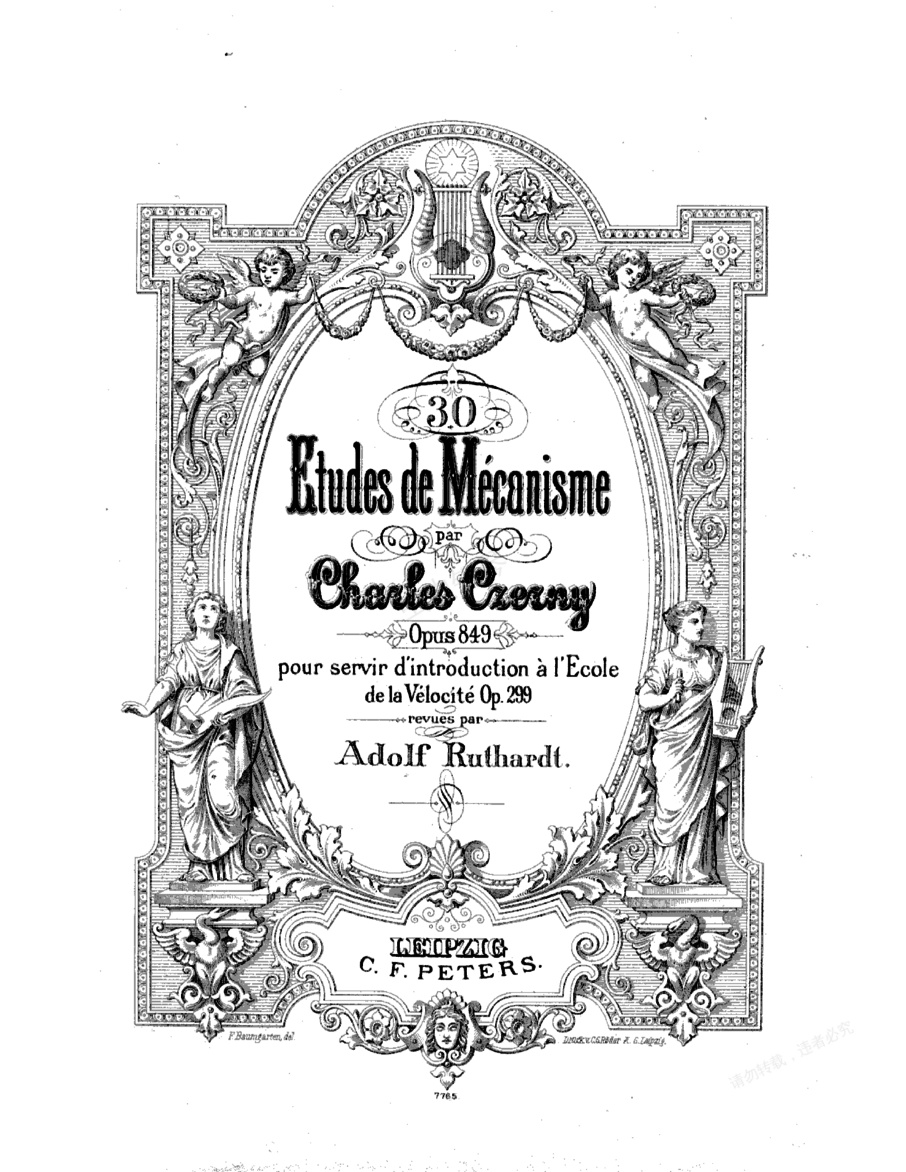 30首新钢琴技巧练习曲 Op.849 车尔尼的《三十首新钢琴技巧练习曲》30 New in Op.849(又译“钢琴流畅练习曲”),一般的学生大概在《钢琴初级练习曲》Op.599 弹到70条左右就可以接上了。但对于年龄较小的琴童,或者基础打得不是怎么最好的,可能还得根据手指独立的不同情况,作些适当的补课,例如用车尔尼《钢琴简易练习曲》Op.139 作为过渡。 能够把这些曲子都弹出来并非一件难事,但所谓“流畅练习曲”,顾名思义,就得有一定的速度,真要达到这个要求,则需要花番工夫了。首先我们要让学生在手指初步独立的前提下,学会根据不同的音型加上与此相适应的手腕动作,以便应对较长时间的同一音型的反复——须知这是19世纪音乐最普遍的织体构成方式之一。