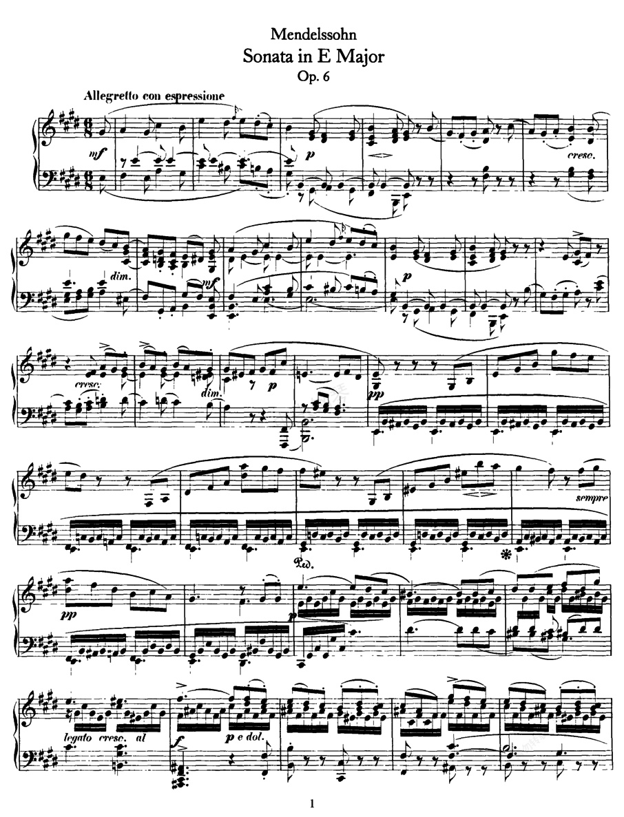 E大调第一钢琴奏鸣曲 Piano No.1 in E Major Op.6 门德尔松最优秀的钢琴作品包括:无词歌、随想曲、协奏曲、谐谑曲和前奏曲等,但不包括他的钢琴奏鸣曲。这也并不是没有道理的。门德尔松一生中创作了三部钢琴奏鸣曲,均为年轻时代的作品。尽管它们流畅、灵活和富于感情,但在整体上却给人以含糊、不愉快、甚至是不安的感觉。门德尔松大概自己也意识到了这一点,因此在他17岁之后再也没有创作过钢琴奏鸣曲。 《E大调第一钢琴奏鸣曲》Piano No.1 in E Major Op.6 ,完成于1826年3月22日。虽称之为“第一钢琴奏鸣曲”,实际上它是三部钢琴奏鸣曲中最后完成的(另两部分别完成于1821年和1824年,编号为Op.105 和Op.106),只是按出版编号将其划分为“第一”。也正是完成这部作品后,门德尔松再也没有写过钢琴奏鸣曲。全曲共分成四个乐章,各乐章间的联系紧密,连续演奏,其中以第三乐章为整部作品的核心部分: 第一乐章,有表情的快板,E大调,6/8拍。这是一个带有田园气息的乐章,其中的多声部和快速音符等素材让人联想起贝多芬《D大调第十五钢琴奏鸣曲“田园”》Op.28 的第一乐章。 第二乐章,小步舞曲速度,升f小调,3/4拍。中部转入D大调。 第三乐章,宣叙调式的柔板-行板-有表情的小快板,E大调,3/4(6/8)拍。 第四乐章,活泼的甚快板,E大调,4/4拍。高潮过后,在尾声部分还轻轻再现了第一乐章的片断至结束全曲。