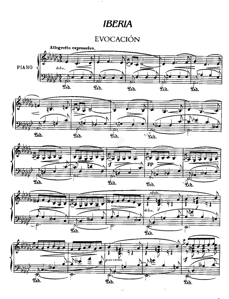 伊贝利亚组曲 Suite 钢琴组曲《伊贝利亚》 是阿尔贝尼兹晚年心血的结晶,体现着他的艺术颠峰。整部作品共由十二首曲子组成,分成四卷,每卷各含三首曲子。前三卷的九首完成于1906年,第十、十一首完成于1907年,而最后一曲则完成于他生命最后1909年的1月,该年5月他就病逝了。这部作品运用了西班牙的舞曲节奏并与钢琴技巧相结合。德彪西在评价阿尔贝尼兹时说:“他并没有实在引用民间音乐的主题,但是民间音乐却毫无痕迹地潜入了他的音乐。”当年德彪西最喜欢的是第七曲,他说世上只有极少数作品能与它比美。这套钢琴曲作于德彪西的《意象》与《版画》之后,与德彪西有相似味道,但感觉这套组曲的东方色彩比德彪西还要浓郁。 “伊比利亚”是西班牙半岛的拉丁名称,这十二首作品分别是: 第一卷 Book I 1. 回忆 ,降a小调,3/4拍,有表情的小快板,安达卢西亚民歌; 2. 海港 El ,降D大调,6/8拍,有节制的快板,描写了一处胜地的节日; 3. 塞维利亚圣体祭 El en ,升f小调,2/4拍,优雅的快板; 第二卷 Book II 4. 隆岱那舞曲 ,D大调,6/8拍,小快板,是一种轮转舞; 5. 阿美利亚 ,G大调,6/8拍,中庸的快板,描绘地中海沿岸一城市; 6. 特利安那 ,升f小调,3/4拍,生动的小快板,描绘塞维利亚城郊吉普赛人聚居地; 第三卷 Book III 7. 阿尔拜辛 El ,降D大调,3/8拍,忧伤的甚快板,这是一首吉普赛歌曲; 8. 波罗 El Polo ,f小调,3/8拍,伤感的快板,安达卢西亚的歌曲和舞曲; 9. 拉伐皮厄 ,降D大调,2/4拍,节奏非常匆忙的小快板,马德里市一地区; 第四卷 Book IV 10. 马拉加舞曲 ,降b小调,3/4拍,活泼的快板; 11. 耶雷兹 Jerez ,a小调,3/4拍,小行板,吉普赛舞曲; 12. 埃利塔那 ,c小调,3/4拍,优雅的小快板,描绘的是塞尔维亚郊区的一酒店。