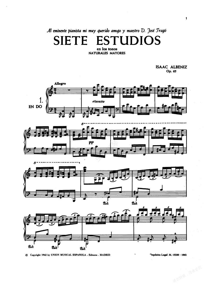 7首练习曲 7 Op.65 《七首练习曲》Siete Op.65 ,副标题“七首自然大调练习曲”en los tonos ,约作于1887年。 1. C大调,2/4拍,快板,托卡塔风格练习曲。 2. G大调,6/8拍,小快板,和弦练习曲。中段转入降E大调,并标有“舒曼风格”A La。 3. D大调,2/4拍,小快板,节奏练习曲。 4. A大调,3/4拍,双音练习曲。中段转入F大调。 5. E大调,3/4拍,手指扩张练习曲。中段转入A大调的左手练习曲。 6. B大调,6/8拍,左手练习曲。 7. F大调,4/4拍,快板,和弦及顿音练习曲。