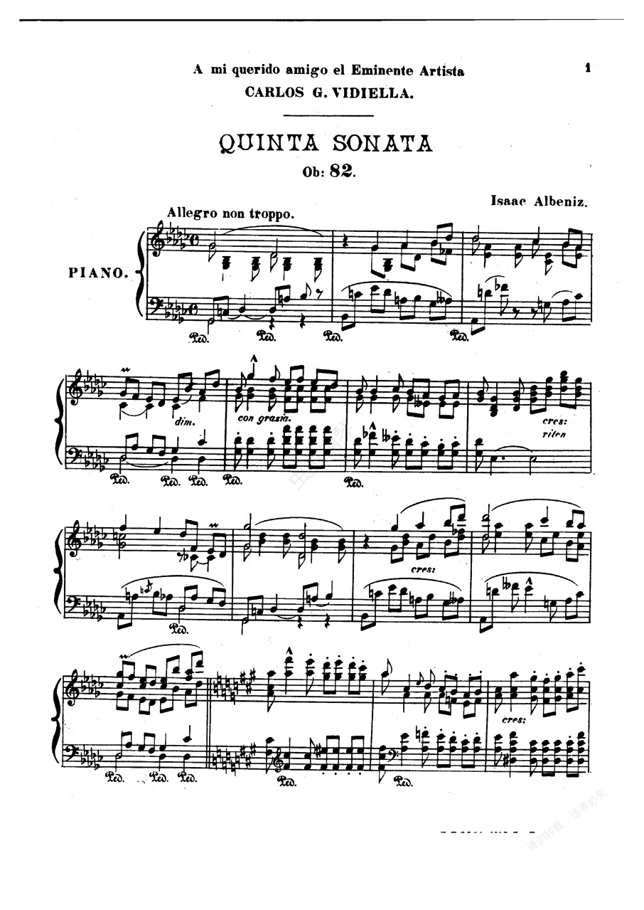 降G大调第五钢琴奏鸣曲 Piano No.5 in Major Op.82 《降G大调第五钢琴奏鸣曲》Piano No.5 in Major Op.82 ,于1887年出版,题献给卡洛斯·维迪拉( G.)。全曲共四个乐章: 第一乐章,不过分的快板,降G大调,4/4拍。 第二乐章,副标题“法国小步舞曲” del Gallo ,甚快板,E大调,3/4拍。 第三乐章,副标题“梦幻曲” ,行板,D大调,4/4拍。 第四乐章,快板,降G大调,3/4拍。