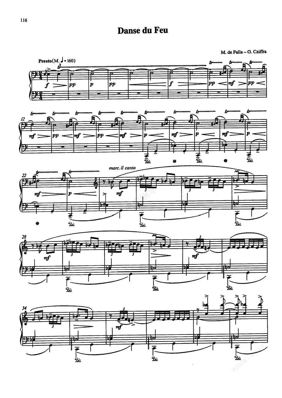 火祭舞 Fire Dance - 选自舞剧《魔法师之恋》 《魔法师之恋》L'Amour 是法雅根据安达卢希亚民间传说写成一部舞剧,剧情大致是:美丽的吉普赛女郎坎黛拉爱上了卡梅洛,但她经常遭到已故情人的幽灵缠绕,这个鬼魂每次都要来阻止这对情人的接吻。坎黛拉知道已故的情人是一个好忌妒的家伙,同时也是一个好色之徒,于是她说服了自己的女友露西亚,让她去引诱那个幽灵。从此幽灵不再出现,这对情人终于能自由地交换“纯粹爱情之吻”。 在这部舞剧的十三段音乐中,以第五段“恐怖舞”和第八段“火祭舞”尤为出名。它们不仅以原先的管弦乐曲形式出现,而且常常以钢琴独奏或双钢琴改编曲形式单独演奏,并且被不少名演奏家列入自己的保留曲目之中。 《火祭舞》 Fire Dance 这段音乐以中提琴和单簧管奏出的一个神秘怪诞的颤音作为开始,它忽紧忽慢、忽轻忽响,就好像从洞穴潮湿的岩壁上反映出来的微光,闪闪烁烁、飘忽不定。在这个背景上,双簧管从容地奏起了一支极富魅力的舞曲。粗犷而豪放的第二主题由第一小提琴和法国号奏出,紧接着的两支长笛的复述听来就像是这支旋律的回声。随后出现的一个主题与第二主题极为相似,它由轻到响,马上又沉寂下去,就像巨浪一样,一次次地涌来,显示出极大的力量。此后,最初的颤音又回来了。随即各个主题几乎照原样再现。最后速度加快,小号的齐奏使气氛显得更为狂热,到达了全曲的高潮。全曲以乐队全奏的一连串和弦作为结束。