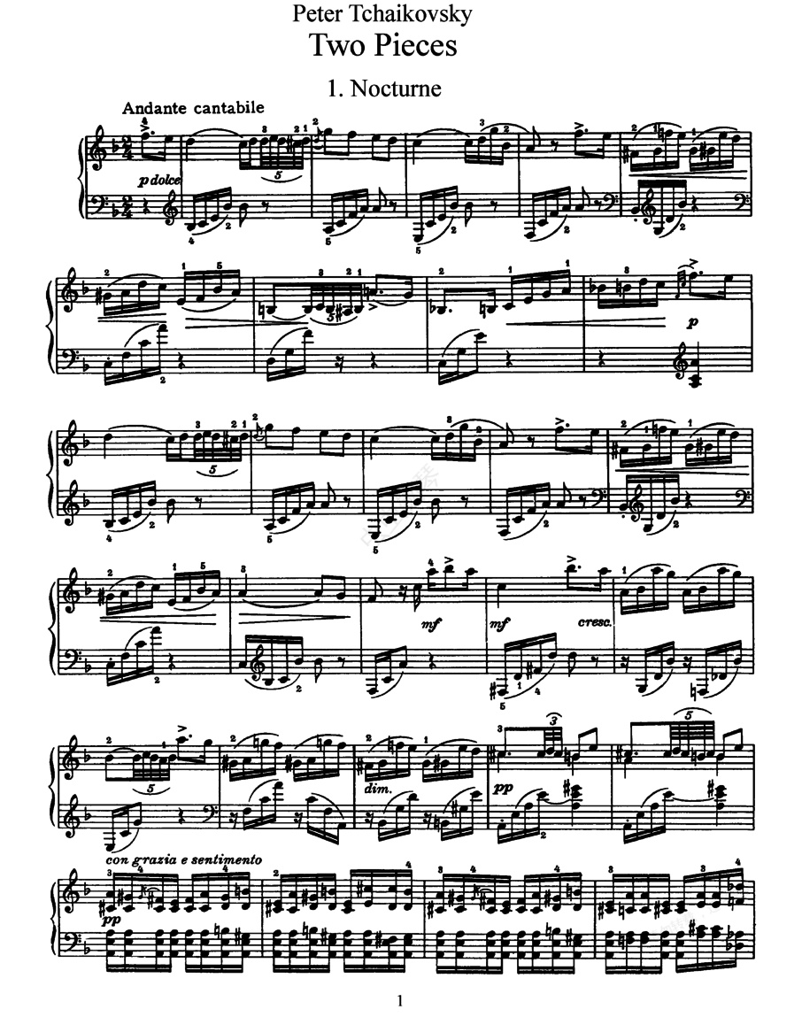 2首小品 Two Op.10《两首小品》Deux Op.10 ,作于1871-1872年,题献给他的朋友弗拉基米尔·斯特潘诺维奇·席洛夫斯基(),两首作品分别于1874年和1875年出版,首次共同出版是于1876年。1. 夜曲 ,F大调,2/4拍,如歌的行板。2. 幽默曲 ,G大调,2/4拍,小快板。中段为降E大调,引用了奈斯(Nice)的民歌旋律。于1876年由作曲家亲自改编成小提琴与钢琴演奏的形式,乐谱于1877年出版。