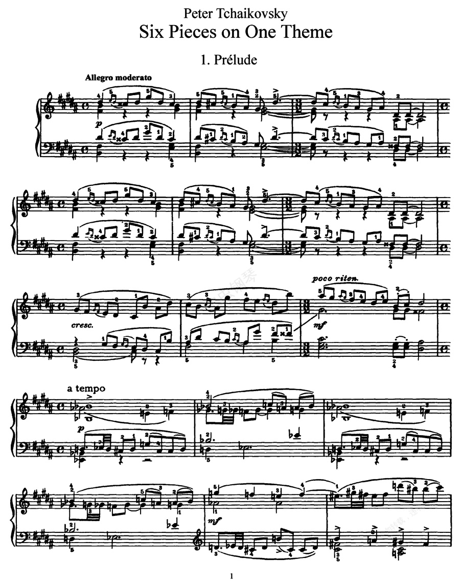 6首单主题小品 Six on a Theme Op.21《六首单主题小品》Six on a Theme Op.21 ,作于1873年9月至11月间,题献给安东·鲁宾斯坦。这六首有着各自小标题的钢琴小品均围绕着同一个主题写成,最初拟定总标题为“组曲”Suite ,但最终柴可夫斯基还是将它命名为“六首小品”。1. 前奏曲 ,升g小调,4/4拍,中庸的快板。2. 四声部赋格 Fugue á 4 voix ,升g小调,4/4拍,行板。3. 即兴曲 ,升c小调,4/4拍,甚快板。4. 葬礼进行曲 Funèbre ,降a小调,4/4拍,中板进行曲速度。5. 玛祖卡舞曲 ,降a小调,3/8拍,中庸的快板。6. 谐谑曲 ,降A大调,6/8拍,活泼的快板。