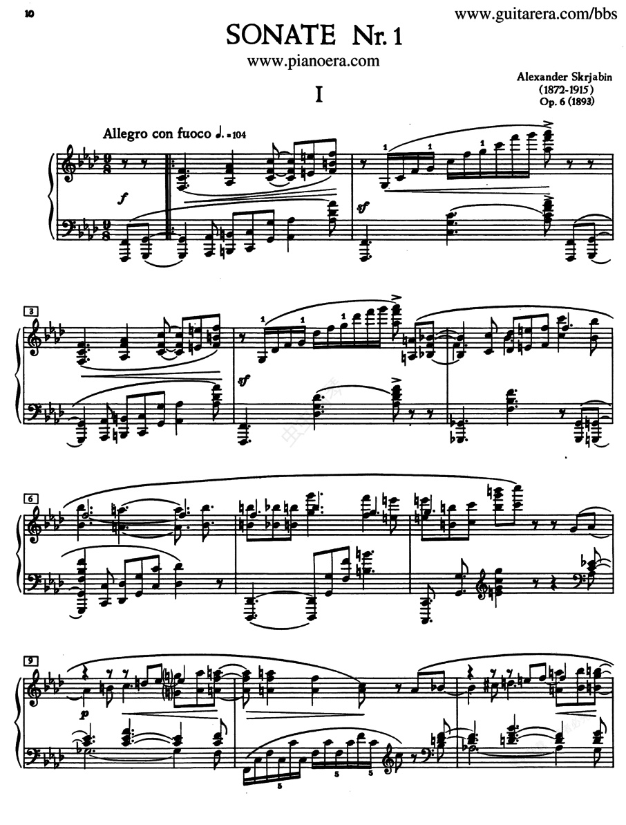 f小调第一钢琴奏鸣曲 Piano No.1 in f Minor Op.6斯克里亚宾是一个交响乐作曲家和钢琴音乐的大师。早期作品以新的方式继承了俄罗斯古典传统。他的作品充满了尖锐的戏剧性和英雄气概及乐观向上的刚毅精神,旋律宽广,情感激昂,结构宏伟而精致,爱用庞大的管弦乐编制,音响既浑厚而又细腻,力度对比强烈。其早期钢琴作品,广泛地运用了钢琴的技巧和表现力,音乐形象鲜明,充满热情,紧张的节奏与尖硬的和声时常出现,他大量运用复杂和弦,强调和声的紧张度和不协和,表现作家内心感受到的尖锐的、不可缓解的冲突。斯克里亚宾的创作不仅为俄国现代主义音乐开了先例,也是欧洲无调性音乐和光色手法的肇端。但这种摆脱了传统的音乐,虽曾一度引起音乐界的轰动,但随着二十世纪新古典主义及其它流派的兴起,他的作品也受到怀疑和否定。但是,他的音乐语言以及和声技法在所有近现代音乐家中都是独树一帜的,尤其是他的十首钢琴奏鸣曲,贯穿了他一生的创作观念和实践,不仅是他各创作历程及哲学精神的阶段反映,而且是其高超钢琴写作技法的具体表现。因此,斯克里亚宾的钢琴作品仍是钢琴音乐宝库中不可替代的组成部分。斯克里亚宾的十首钢琴奏鸣曲充分反映了其力图用音乐来揭示某种真理,表达整个世界观的创作思维,是斯克里亚宾钢琴音乐作品中成就最高的部分,是作曲家创作道路上的主要标志。这些奏鸣曲可按三个创作时期来分类:第一号至第三号属受肖邦李斯特深刻影响的第一时期。第四、第五号为向他自己风格转型时期,此时深受瓦格纳影响,但已开始转向宗教神秘主义。第六号以后确定了他自己神秘主义的、新的和声语言方法。——————————————————————————————————————————————————《f小调第一钢琴奏鸣曲》Piano No.1 in f Minor Op.6 ,作于1893年,也就是他在莫斯科音乐学院毕业后的第一年。斯克里亚宾在创作备忘录中记此曲要表现的是: 1.善,理想,真实,在另一边的目标; 2.追求,失败而绝望,反叛神明; 3.探索内心的理想,抗议,自由; 4.为了自由的学问基础; 5.宗教。这部奏鸣曲从形象的范围和表现手法来看还没有很突出的独创性,第一乐章的呈示部中的主部与副部的连接段、还有接下来的副部,都可以说是肖邦式的音乐,不可避免的流露出他早期创作的模仿阶段以及对肖邦等的偏爱。但在乐章之间已显出作者的情绪飘忽不定;而在节奏紧迫、来势汹涌的急板之后,继之以阴惨沉重的送葬进行曲结束全曲,尤其令人感觉突然。十九世纪90年代是斯克里亚宾的哲学思想形成的时期,他读了许多哲学书,企图求得解决一些与世界观有关的问题。从青年时代始,他就探索过关于人生,关于人与人之间的关系,关于道德的标准等等问题,他常常联想到宗教和神。当然,这种盲目的探索是不会得到什么正确的结论的。当他在自己的思想的矛盾中找不到出路时,他就陷入悲观绝望的深渊之中。因此他使用了“葬礼进行曲”作为他这部钢琴奏鸣曲的末乐章。斯克里亚宾对待生活的态度,是以个人为中心的,个人的如意或不如意决定着他对于社会生活中所发生的重大事件的态度。斯克里亚宾沿着这样的道路,逐步形成了他的极端主观唯心主义的世界观(他肯定一切都源于“我”,否定了客观世界的存在,说世界是“我的活动,我的创造,我的欲望”的结果)。这部奏鸣曲共有四个乐章:第一乐章,热情的快板,f小调,9/8拍,奏鸣曲式。第二乐章,c小调,4/4拍,三段体。 第三乐章,急板,f小调,12/8拍,回旋曲式,构架,斯克里亚宾说明此乐章是表现”反抗的呐喊,对神明与命运的屈服”。第四乐章,葬礼,f小调,4/4拍,三段体,中段以圣咏来展示“拯救”。
