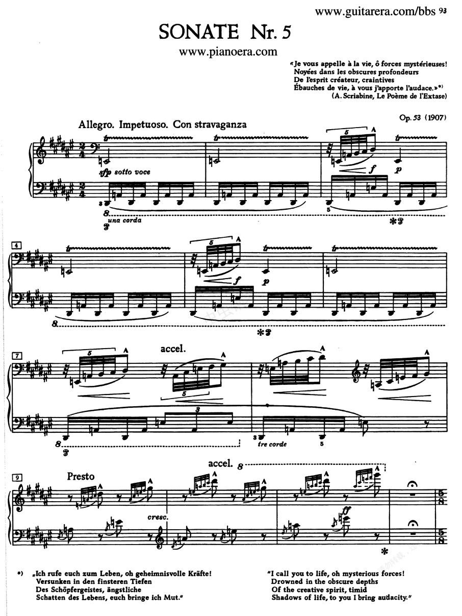 升F大调第五钢琴奏鸣曲 Piano No.5 in Major Op.年开始,斯克里亚宾在一个偶然的机会下开始阅读具有“神秘主义”思想的宗教和哲学书籍,并接触到当时各种哲学思潮,思维空间的开拓使他对之前模仿肖邦式的音乐创作产生了怀疑和否定,他渴望从新的创作中找到“真实的”、“自我的”斯克里亚宾。他时常在思考中随手写下:我是自由的,我是有生命的,我是疲劳的,我是幸福的,我是一个梦境,我有狂妄的热情,我不停的埋藏住自己的渴望,我有什么都不是……等词句。1904年斯克里亚宾辞去莫斯科音乐院教授的职务,离开了祖国。1905-1907年俄国革命时期,他侨居外国。当听到祖国传来革命的消息,曾表示过同情,并曾阅读过马克思和思格斯的哲学著作。但是从他的札记看来,他是完全不能正确理解他们的哲学思想的。他在瑞士曾和普列汉诺夫相交。一个辩证唯物主义者和一个主观唯心主义者,虽然是很好的朋友,但经常展开激烈的辩论。斯克里亚宾坚持自己的反动观点,普列汉诺夫对他下了如下的鉴定:“多么有热情、有才能的人呵,可是又是一个顽固不化的神秘论者。他所写的音乐,气派很大。这种音乐是具有唯心主义的神秘论者的气质和宇宙观的人对于我们的时代的反映。”1905年俄国革命时期,是斯克里亚宾的思想和创作的危机的开始。从这时起,他的创作显然转向极端主观唯心主义,逐渐形成一种抽象、玄虚的风格。1907年写成的《狂喜之诗》和不久之后写成的《第五钢琴奏鸣曲》,都标志着这种转变。虽然这两首作品在结构上没有什么关连,但是其创作的精神和要表达的理念却是一致的。斯克里亚宾企图在这两部作品中表现概括宇宙万象和具有世界意义的思想感情,但实际上所表达出来的却是极端狭隘的个人的精神状态。《升F大调第五钢琴奏鸣曲》Piano No.5 in Major Op.53 ,作于1907年。有人也称之为“狂喜之诗”Le Poeme de l' ,因其在乐谱开头引用了“狂喜之诗”的诗句: “啊,神秘的力量,我向你们召唤,埋藏在深沈幽暗的创造者的灵魂,你们这些生命的怯弱的萌芽,我给你们带来了勇气,动起来吧”诗句中提到的“神秘的力量”、“埋藏在深沈幽暗的创造者的灵魂”,以及“怯弱的萌芽- 这生命的源头”,都反映出斯克里亚宾当时对“生命”的珍惜和对“生”的渴望。为了给那“怯弱的生命源头”勇气,他不断的召唤“生命”,不仅给“生命源头”勇气,也给自己勇气走出模仿肖邦的影子。 借由“狂喜之诗”的创作精神及勇于尝试新手法的斯克里亚宾终于摒弃了传统古典式及十九世纪的写作技巧,它采用单乐章形式,探究迷离的调性新颖的和声音响,速度与节奏的多样化,音响效果空旷、悠远,神秘中透出狂喜的兴奋,追求激情的幻想和灵魂的净化,充分体现了他的“自我”气质。他以敏锐的音乐感唤回沉落在深暗里的创造者的灵魂和精神。斯克里亚宾常常表示:“我是光,我就是这个世界,我狂野的飞翔,我轻柔地抚动着这些升华了的创作,我是拓荒者,我正在高不可攀的顶巅上……”,这些都是深入这首作品内在的最佳诠释。在这个单乐章作品中,我们可以看到“神秘和弦”(四度叠加)、复杂的拍号和非常个性化的记号的使用,斯克里亚宾内心变化的走向在此表露无疑。虽然在谱面上,该曲用六个升号标记“升F大调”,但是整首曲子实际上无法用“调性”这一概念加以解释。整个作品的段落是清晰的,呈示部、展开部、再现部排列有序。在一个短短引子之后,就开始了急速而紧张的奏鸣曲式快板。主题短促而零碎,音乐的发展非常复杂而突然:呈示部有三个部,有别于一般奏鸣曲的主副二部。整个呈示部从第13小节开始至第156小节结束。主部为平行复乐段结构,从第36小节至第46小节,由两个主题组成,第一段从第13小节至第33小节,表情记号“遥远的” ,5/8拍;第二段从第34小节至第46小节,表情记号“抚慰的” ,5/8拍;副部Ⅰ从第47小节至第119小节,是一个对比性的二段体结构,速度标记为“愉快的急板” con ,第一段从第47小节至第87小节,然后是一个连接部,从第88小节至第95小节;第二段从第96小节至第107小节,表情记号为“傲慢的” ;副部Ⅱ从第120小节至第139小节速度记号 “不太快地”Meno Vivo ,表情记号“抚慰的” 。半音阶的进行为主要素材。这首奏明曲的展开手法也显得非常的特殊,整个展开部从第157小节至第428小节。在这个展开部中呈示部中的所有主题都被用于展开,而不似传统奏鸣曲那样只展开呈示部中的某一个或两个主题。同时,在展开手法上也异于传统奏鸣曲:传统奏鸣曲展开部是将呈示部中主部或是副部的某一主题,运用反复、分裂、变奏、移调、对位等手法加以展开,一般都会把呈示部的素材发展成完整乐句的形态,当运用多个主题材料时,往往只有一个主题材料是主要的;这首奏鸣曲的展开手法则是将呈示部中的各个主题以完整形态用片段交错的方式组合构架而成,各个主题材料之间也无明显的主次之分,如第157小节至第165小节和第247小节至第262小节是完整的引子主题,第185小节至第190小节、第207小节至第210小节及第228小节至第246小节都是完整的副部Ⅰ之第一主题。主题出现的顺序,展开部的情绪和呈示部是相一致的。所以,这个展开部与呈示部联系紧密且一脉相承的。显然,展开部在这里的作用是加强呈示部主题的音乐形象,对呈示部中所出现的创新技法加