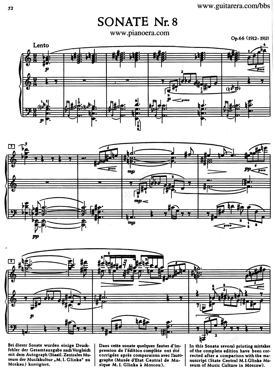 A大调第八钢琴奏鸣曲 Piano No.8 in A Major Op.66斯克里亚宾一生中共创作了十首钢琴奏鸣曲,然而《第十钢琴奏鸣曲》并非是他最后完成的。虽然他在1912年就已经开始构思《第八钢琴奏鸣曲》,可是这《第八钢琴奏鸣曲》的写作过程并不顺利,一直到1913年的秋天,在他回到莫斯科之后才完成的,生前也没有公开发表这首奏鸣曲,他却一再的声称喜爱这首作品甚过《第十首奏鸣曲》,这也是他最后想要写作的题材。 《A大调第八钢琴奏鸣曲》Piano No.8 in A Major Op.66 ,有人认为,这首看似无调性的作品其实可以看成是A大调。斯克里亚宾对此曲的解说:“这里用来对位的音都变成和声,这些音不像巴赫那样对位,而是彼此调和的。”此曲为单乐章,9/8拍,序奏为缓板,主部为兴奋的快板,奏鸣曲式。在序奏中就呈示了许多基本动机,和声构造沿用神秘和弦。第—主题以印象派型音响予以发展后再呈示一次,移至第二主题。发展部、再现部均以发展、再现第二主题为主。