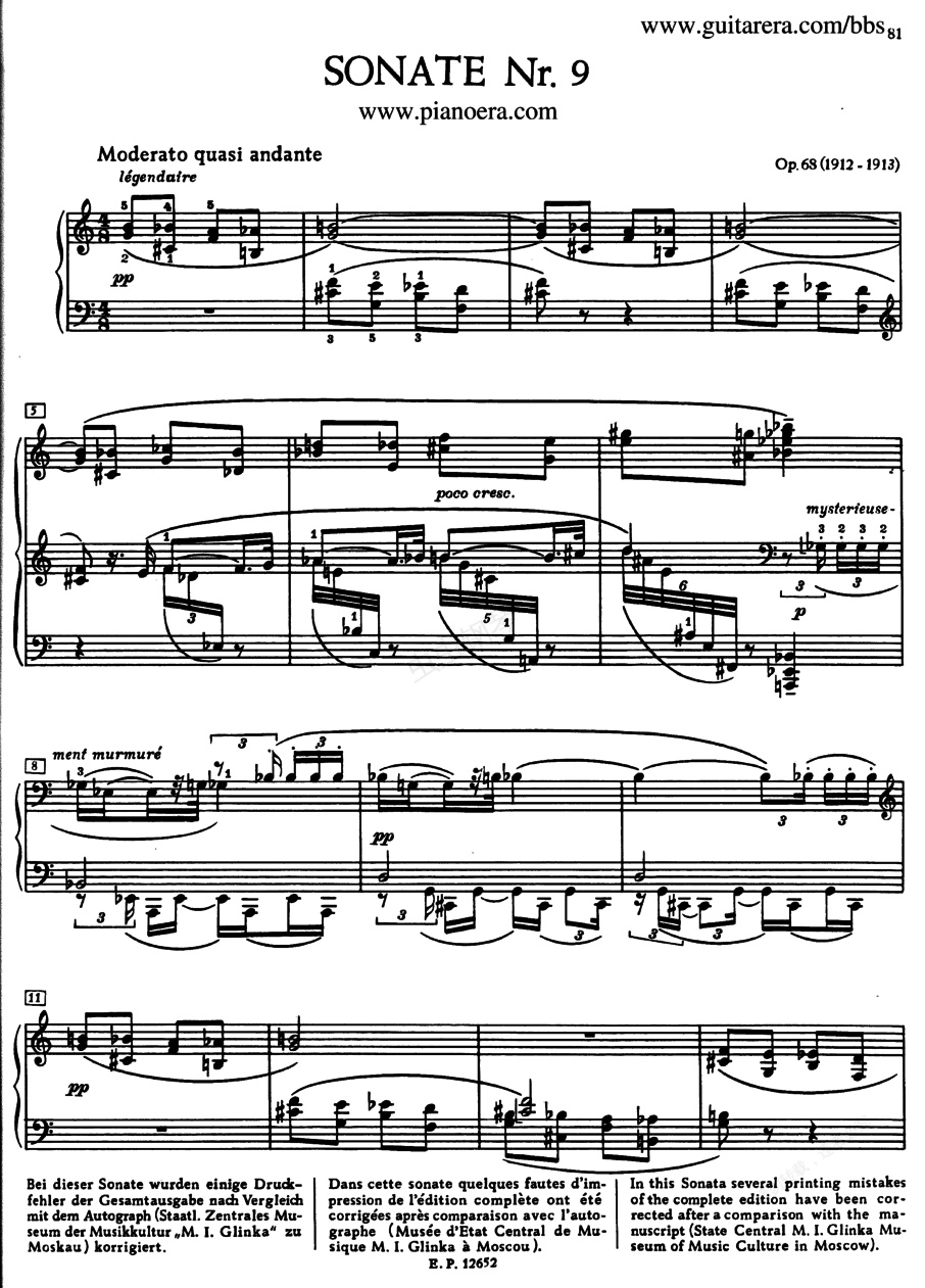 第九钢琴奏鸣曲“黑色弥撒”Piano No.9 "Black Mass" Op.68《第九钢琴奏鸣曲》Piano No.9 Op.68 ,副标题“黑色弥撒”Black Mass ,作于1912-1913年。这首钢琴奏鸣曲表现的是阴森的、魔鬼般的气氛,与《第七钢琴奏鸣曲“白色弥撒”》所表现的“神圣”相对应,形成了两种相对立的色彩——“黑”与“白”。斯克里亚宾的音乐一向具有多变的情绪转换:喜悦、恐惧、光明、黑暗、幸福、邪恶、狂喜、神秘等,而他本人也同样有着多种相矛盾却并存的情绪。而这两首作品所表达的都是和他的“奇迹剧”的创作思想密切联系的。这首“黑色弥撒”为单乐章作品,4/8拍,自由奏鸣曲式。有着神秘的开始,灿烂的高潮,冥想般的结束。第一主题以神秘音响为主要素,反复两次后,经分散和弦的经过部,第二主题在内声部出现,以第二主题的后半部为呈示部小结尾。发展部以发展第一主题的第一、三个动机始,着力于第二主题发展。再现部为发展部再现后,极快板,第—主题主要动机浓缩为十六分音符达到高潮后,第二主题显现,第一主题开头部分形成沉思的结尾。