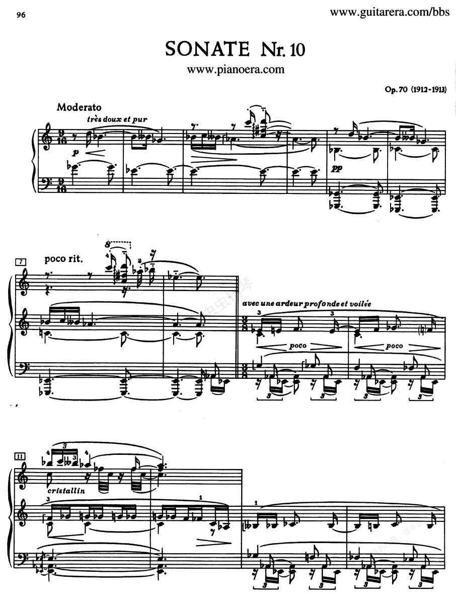 第十钢琴奏鸣曲 Piano No.10 Op.70斯克里亚宾在完成了《第九钢琴奏鸣曲》之后,很快的,于同年(1913年)《第十钢琴奏鸣曲》也跟着发表了。那年夏天,他来到奥卡河(Oka River)边的小镇阿莱科辛(),那里美丽、壮观的森林,芬醇的大地及艳丽的太阳都是激发他创作《第十钢琴奏鸣曲》的动机,因此比起其他的作品,这首《第十钢琴奏鸣曲》Piano No.10 Op.70 的内容更为灿烂、明亮;他以客观的、理智的情感来阐述他的想法,曲风更行自由和即兴。他曾表示这首作品真正要描写的是印象中的森林。在描述这首作品时,他说:“我的《第十钢琴奏鸣曲》是‘昆虫奏鸣曲’。昆虫由太阳生,……,他们是太阳之吻,……,当你以这种眼光看待世界时,宇宙是多么和谐统一。”正因为斯克里亚宾热爱自然,因此设法将大自然的生命音乐化。对他而言,森林就是一座曙光四射的大教堂,在里面所有的生物都散发着希望的光亮。而沙漠则是烈阳拥吻的大地,….在温暖的阳光下,虫儿展开它的生命,颤抖的双翅喜悦地拥抱朝阳。作品所表现的是一种泛补论者所想象的光明色彩。曲子中用了许多的“颤音”隐喻飞扬的双翅,因此这首作品又被称为“昆虫奏鸣曲” of 或是“颤音奏鸣曲”Trill 。其中高超的技巧及复杂的结构和特殊的表达方式令人叹为观止,因此一经发表就被誉为当代最伟大的创作之一。作品为单乐章,9/16拍,自由奏鸣曲式。第一主题仍分为两部分,A挟着B的动机,第二主题与之形成对比,第一主题的B部分略为发展形成呈示部小结尾,发展部由第一主题诸动机发展,第二主题展开时,半音旋律处理得极有神秘性。第一主题的B发展伴随微妙的分散和弦,再由第二主题开始再现部,第—主题B动机再现后,进入小结尾。斯克里亚宾为六个主题都作有标题:“非常宁静和透明的”,“隐含着极深刻热情的”,“光亮地震动着”,“充盈着感情的”,“快乐得近乎狂喜的”,“狂喜而温柔的”。乐曲营造出一种氤氲隐约的气氛,并给人以闪闪发亮的感觉,情感的表达在激动、平静、强劲、轻柔中收放自如,第一主题的旋律犹如布谷鸟的叫声,弥漫着如雾气般的静谧,而当那些如振翅般的“颤音”出现时,则会令人兴奋得难以自持,乐曲结束前的最后几个音符,以轻轻叩击的琴音揭示了进入狂喜之境的神秘和温柔。对于斯克里亚宾来说,在错综复杂的声部中寻找主题,就如同在人生中寻找真理一样;他通过自己的音乐全面剖析了“存在”的价值,以此向世人证明,神学、宗教和哲学是教导人类生活、教化人类灵魂的唯一真理。在对神学、宗教和哲学的狂热之外,斯克里亚宾还更加向往宇宙之光的神奇,他认为声音与光是一体的,每个调性都有一种对应的颜色和光亮,在他心中,太阳是宇宙之神,也是他创作的源泉,他曾说“当你聆听我的音乐时,请注视着太阳吧。”就这样,自认为是“上帝”的斯克里亚宾,放纵于自己的狂傲,谱写出那些非比寻常的神秘之声,并在自己的乐音中寻到了真实的“自我”,就如《压抑与理想》中的两个精灵那样,沉醉于自身的狂热欲望之中,而抵达全然忘我的狂喜之境。