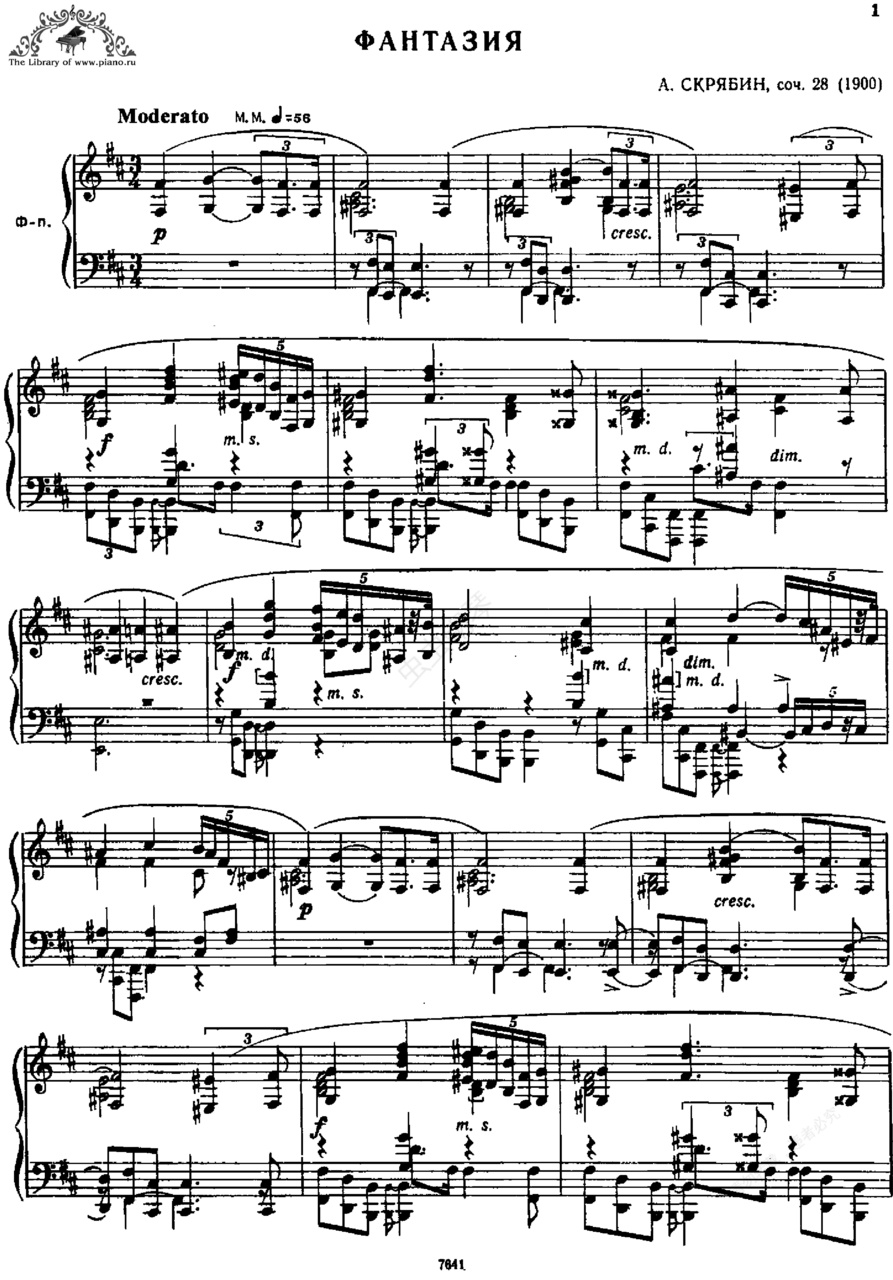 b小调幻想曲 in b Minor Op.28斯克里亚宾早年曾经是肖邦的继承人,这从他的早期钢琴奏鸣曲可以看出,非常浪漫和精致。其中最受喜爱的《第二钢琴奏鸣曲》第一乐章即非常引人入胜。另一部作品《b小调幻想曲》 in b Minor Op.28 更是一部浪漫的钢琴音诗,宏大而富有激情。这部作品作于1900年,当时他在莫斯科音乐学院任职教授,这也是他在那个时期创作的唯一的一部钢琴作品,同时这部作品也是他的《第三钢琴奏鸣曲》和《第四钢琴奏鸣曲》之间的桥梁,标志着早期创作的结束,中期创作的开始。作品为b小调,3/4拍,中板,奏鸣曲式,全曲结构精细,并充满了艰深的技巧,有大量大跨度和弦和琶音、高密度的多声部对位。其风格跟他的《第三钢琴奏鸣曲》相似,沉思式的引子跟第二主题有关,第三主题则跟日后他的《第三交响曲》密切相关,尾声更是在他日后的《第七钢琴奏鸣曲》中可见。关于这首《幻想曲》还有则小轶事。相传斯克里亚宾在创作了这首作品后,很快就忘记了它的存在。当他的朋友在钢琴上弹奏这个作品的片断时,他居然问道这耳熟的作品为何人所作。当他朋友告诉他这是他的《幻想曲》时,他竟然亦未能想起自己曾经作过这么一首钢琴作品。