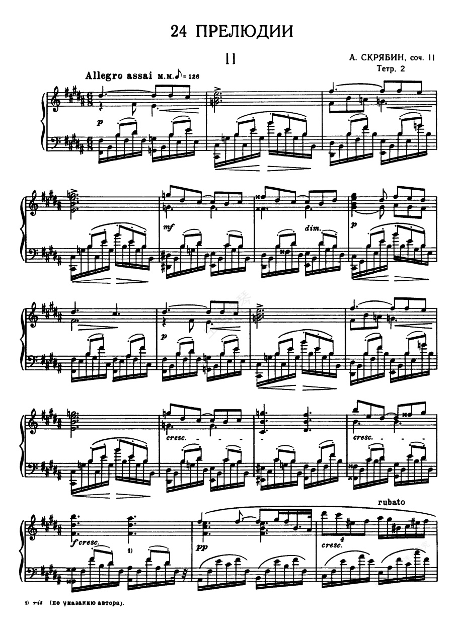 24首前奏曲 24 Op.11前奏曲是斯克里亚宾最喜欢的一种钢琴曲式,在他的钢琴作品中占据重要的位置。研究斯克里亚宾的权威维科特•戴瑞森()写到:“从巴赫到斯克里亚宾,没有哪位作曲家的前奏曲在他的作品中占据如此重要的位置。”前奏曲这种形式看起来好象是和他的开创性的音乐探求精神紧密结合在一起的。斯克里亚宾是一个有着巨大天赋的钢琴演奏家,从年轻时期开始,他就非常喜欢即席演奏。他的即席演奏的水平很早就被很多评论家和学者所承认,而且这种即兴性也体现在他所有的前奏曲当中。1888年到1896年间,斯克里亚宾先后在莫斯科,基辅,海德堡,阿姆斯特丹,维茨瑙,德累斯顿和巴黎写下了这部《二十四首前奏曲》24 Op.11 ,并于1897年出版,为了感谢一位名字叫米卓凡•贝拉耶夫()的音乐爱好者和艺术赞助人,感谢他为斯克里亚宾作品的出版所作出的努力。1899年,此部作品获得享有声望的格林卡奖。斯克里亚宾追随着十九世纪浪漫乐派的惯用音乐手法创作此作品。这部前奏曲以肖邦的《24首前奏曲》Op.28 为范本来创作,使用简单小型的曲式、调性安排、和声结构、分解和弦的伴奏音型、一连串的半音;抒情的曲调、丰富的音色变化与拍号的使用等手法。除了延续后浪漫时期的创作手法,斯克里亚宾更加入自己的音乐语法,独特的踏板效果、多变的技巧、音型和乐曲气氛的营造等,都展现出斯克里亚宾个人的音乐特色。这二十四首前奏曲在安排上和肖邦的二十四首前奏曲采用相同的形式。整个序列的每个片断基于五度音高向上回环。可以非常清楚地知道,当斯克里亚宾写作时,他头脑里想到了肖邦的前奏曲。居伊在1895年这部作品发行前写到:“这不是在模仿肖邦,而是肖邦的那种精神,是斯克里亚宾的全身心投入的创作力量,贯穿其中而完全回归生活的精神。”下面这条评论出自1895年在布鲁塞尔斯的一次演奏之后,“斯克里亚宾是一个感性的音乐家,在思想上参考肖邦和舒曼。他在作曲上极力倾向这两位作曲家,他们的音乐成为他自己创作的基石。”斯克里亚宾的这部前奏曲不仅是小型概论。这是一部完美的,由精心构思的片断组成在一起的,折射出作曲家内心的情绪和景象,一个与众不同的创作世界。它表现出全部的大胆的,心醉神迷的情感,一种找寻完美的,激进的思维表达方式,一种微妙的诗歌式抒情方式的总合。俄罗斯评论家波瑞斯•阿萨菲耶夫(Boris)指出这部作品的本质:“尽管这是一组紧张不安的曲子,斯克里亚宾的音乐体现出着魔般的吸引力和景象。”在他的早期作品里,这些特征都存在着。在这些令人惊讶的精巧的,和由生动的对比而构成的杰出的创作力和想象力的世界,这部《前奏曲集》Op.11 成为斯克里亚宾早期风格的至高的表现。斯克里亚宾自己经常演奏这个作品的片断,但他似乎从来没有完整演奏过这部作品。1. C大调前奏曲 Op.11-1 ,2/2拍,活泼地。2. a小调前奏曲 Op.11-2 ,3/4拍,小快板。3. G大调前奏曲 Op.11-3 ,3/4拍,活泼地。4. e小调前奏曲 Op.11-4 ,6/4拍,慢板。5. D大调前奏曲 Op.11-5 ,4/2拍,如歌的行板。6. b小调前奏曲 Op.11-6 ,2/4拍,快板。7. A大调前奏曲 Op.11-7 ,6/8拍,甚快板。8. 升f小调前奏曲 Op.11-8 ,3/4拍,激动的快板。9. E大调前奏曲 Op.11-9 ,3/4拍,小行板。10. 升c小调前奏曲 Op.11-10 ,6/8拍,行板。11. B大调前奏曲 Op.11-11 ,6/8拍,甚快板。12. 升g小调前奏曲 Op.11-12 ,9/8拍,行板。13. 降G大调前奏曲 Op.11-13 ,3/4拍,慢板。14. 降e小调前奏曲 Op.11-14 ,15/8拍,急板。15. 降D大调前奏曲 Op.11-15 ,4/4拍,慢板。16. 降b小调前奏曲 Op.11-16 ,5/8+4/8拍,神秘的。17. 降A大调前奏曲 Op.11-17 ,6/4拍,小快板。18. f小调前奏曲 Op.11-18 ,2/4拍,激动的快板。19. 降E大调前奏曲 Op.11-19 ,2/4拍,感情丰富的。20. c小调前奏曲 Op.11-20 ,3/4拍,热情的。21. 降B大调前奏曲 Op.11-21 ,3/4拍,行板。22. g小调前奏曲 Op.11-22 ,3/4拍,慢板。23. F大调前奏曲 Op.11-23 ,3/4拍,活泼地。24. d小调前奏曲 Op.11-24 ,6/8+5/8拍,急板。