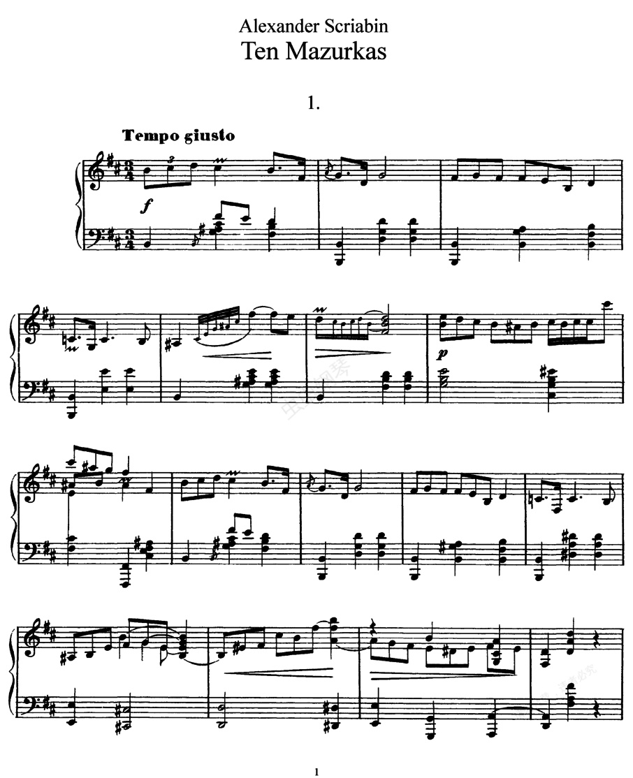 10首玛祖卡 Ten Op.3玛祖卡舞曲是一种三拍子的波兰民间舞曲,速度有快、中、慢三种。这种舞曲的特点是每小节的重音常常在第二或第三拍上,加上旋律经常有跳跃的进行,附点音符比较多,但这些只不过是外在的特征,要分辨玛祖卡舞曲,还要从它所表现的波兰民族性格和气质来断定。玛祖卡舞曲其实只是一个总称,它包括有玛祖尔、库亚维克和奥别列克等好几种舞曲,19世纪波兰作曲家肖邦写过五十几首玛祖卡舞曲,显现了一个多采而妙想纷呈的局面,但它们都是用钢琴独奏的。斯克里亚宾的创作早期受到肖邦的影响,也写了23首钢琴独奏的玛祖卡舞曲,尽得肖邦的神髓,十分动听。《十首玛祖卡》10 Op.3 ,作于1888~1890年间,当时的斯克里亚宾还是一位青少年,但他已经开始发现日后他所使用的音乐语汇,在这部作品中我们可窥见一斑。这十首玛祖卡于1893年分为两集出版,它们分别是:1. b小调,适中的速度,可以明显地看出肖邦及舒曼对斯克里亚宾的影响。2. 升f小调,不过分的小快板,乐句连接处令人耳目一新。3. g小调,小快板,洋溢着哀愁的旋律,对肖邦的回忆。4. E大调,中板,旋律流畅而高雅。5. 升d小调,悲恸地,旋律复杂而富于沉思,反映斯克里亚宾往后的作品的痕迹。6. 升c小调,谐谑地,奇特而类似谐谑曲般,中段稍慢的。7. e小调,热情洋溢地,充满激情而难忘的旋律。8. 降b小调,稍快地,有着入梦般的旋律,怀念肖邦。9. 升g小调,作曲家忽略了速度标记,全曲充满忧伤的旋律。10. 降e小调,极为微弱地,充满渴望及情趣。